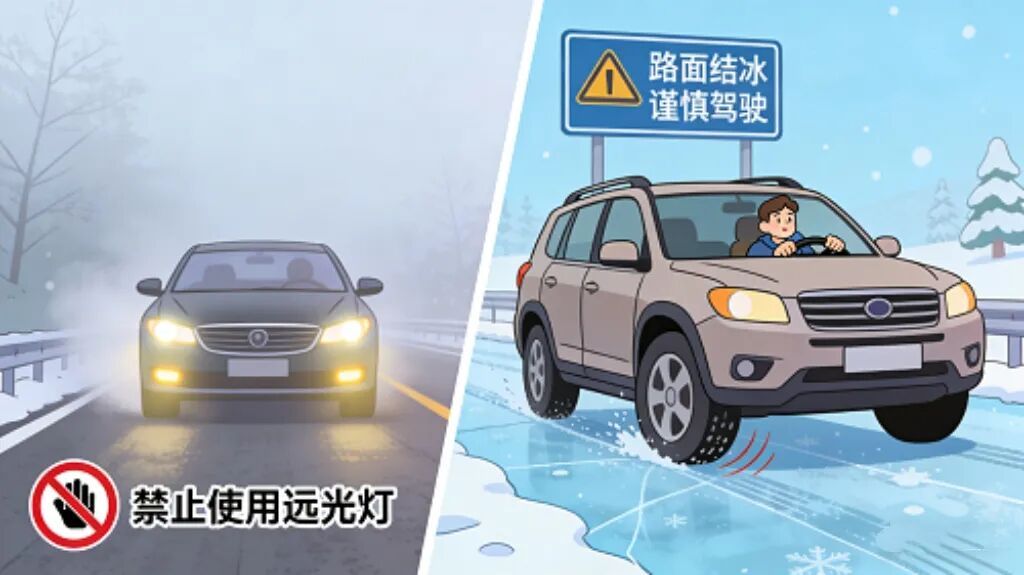 5. 雨雪、大雾等低能见度天气行车时,及时开启近光灯、示廓灯,不使用远光灯炫目;机动车遇路面结冰路段,需平稳操控方向盘,避免急刹车、急转向。