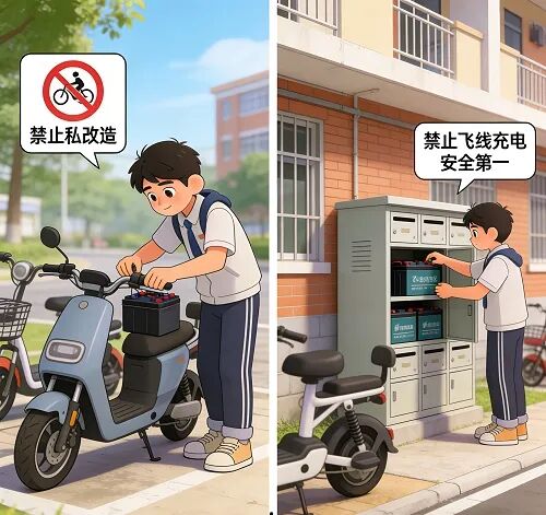 3. 电动自行车须符合国家相关标准,严禁私自改装;蓄电池需在指定安全区域充电,坚决杜绝“飞线充电”,以及在室内、楼道等公共区域违规充电;冬季低温下,避免长时间搁置后突然大功率骑行,充电时注意防火防短路。