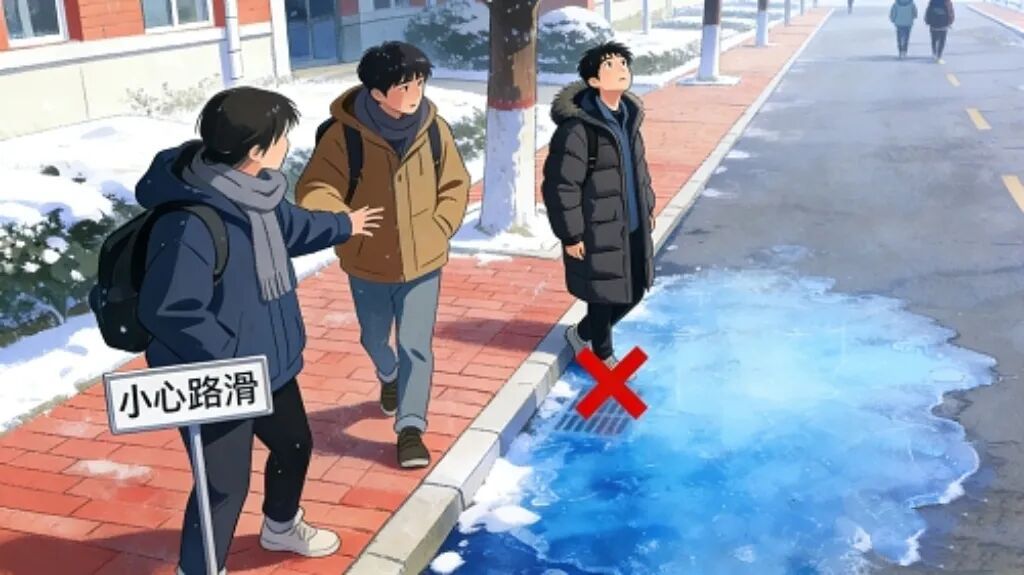3. 行走时不低头看手机、不戴耳机听音乐、不追逐嬉戏打闹,尤其在教学楼、宿舍楼、食堂出入口等人员密集区域及路面结冰路段,要提高注意力,放慢脚步,防止滑倒。