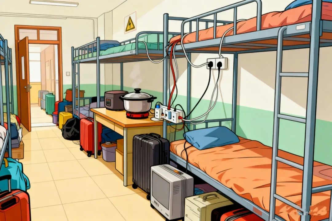 2.宿舍区域:使用大功率电器(电暖器、卷发棒、电煮锅等);私拉乱接电线、床头充电线缠绕被褥;多个设备共用一个插线板超负荷运行;杂物堵塞疏散通道、遮挡灭火器。