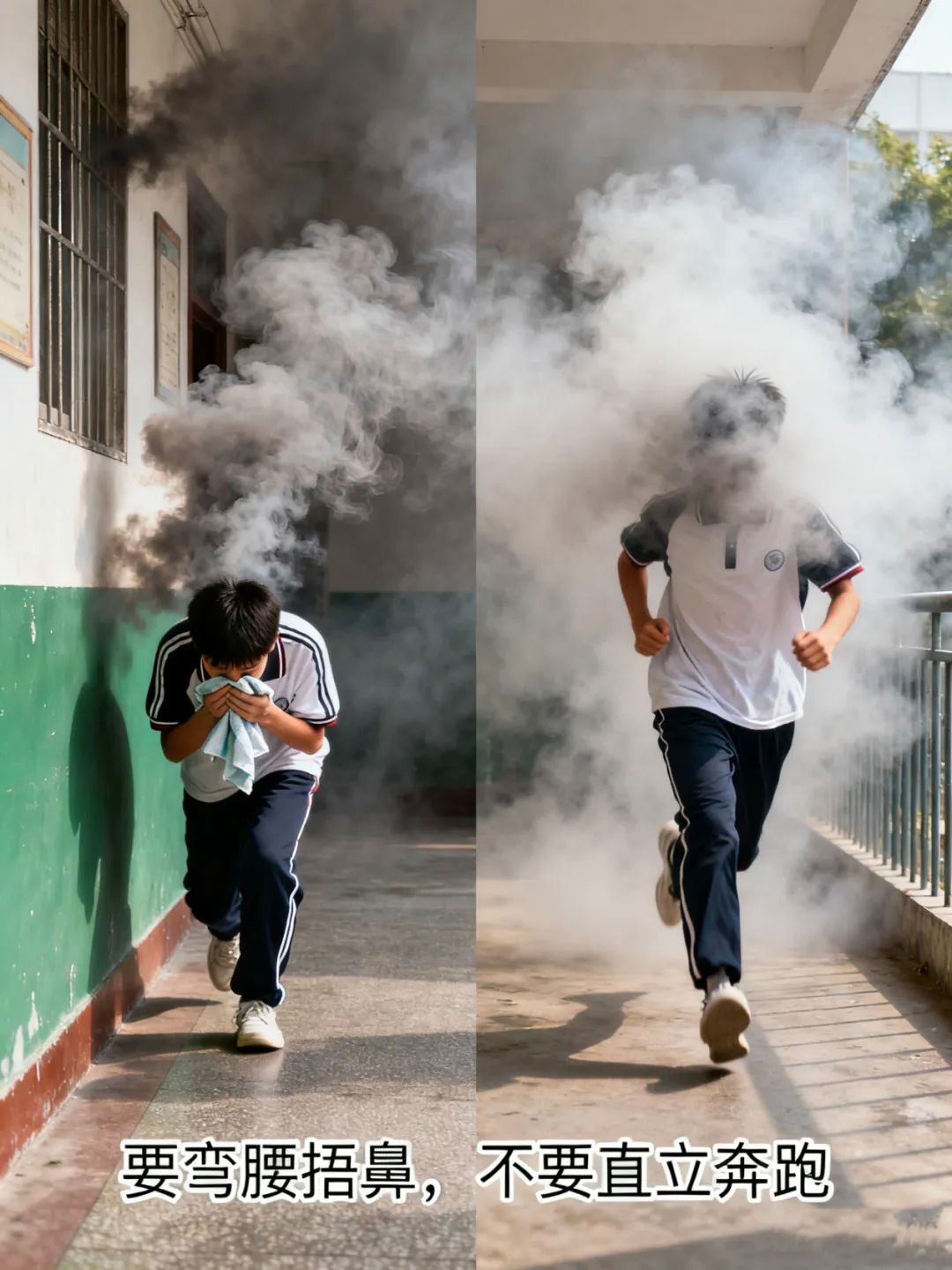 2. 要弯腰捂鼻,不要直立奔跑:火灾中有毒烟雾会快速下沉,需用湿毛巾(或衣物)折叠3-4层捂住口鼻(湿毛巾仅过滤烟尘,无法防有毒气体),弯腰低姿沿墙壁行走,避免吸入浓烟;若有过滤式消防自救呼吸器(防烟面罩),优先佩戴后撤离。