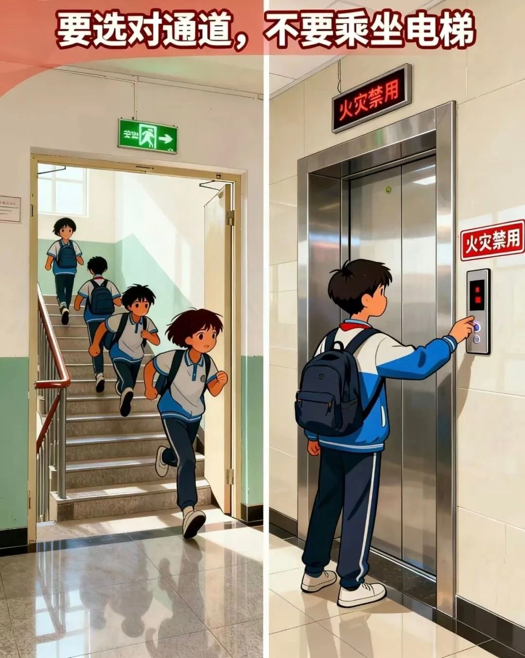 3. 要选对通道,不要乘坐电梯:优先选择疏散楼梯逃生,电梯井可能因火灾断电或成为“烟囱”,极易被困;若楼梯间充满浓烟,可退回有窗户的房间,关闭房门用湿毛巾封堵门缝,挥舞鲜艳衣物呼救,等待救援。