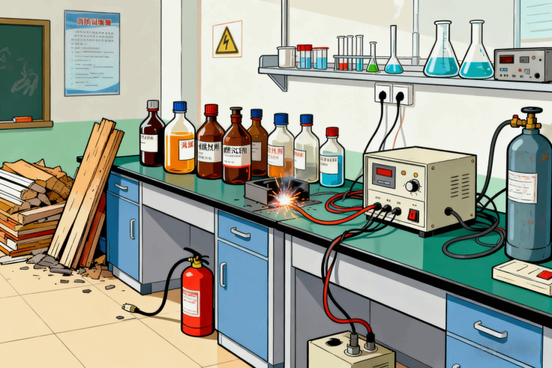 1.实训基地(重点区域):焊接、切割等动火作业未落实审批手续;易燃试剂(如酒精、丙酮)未按规定分类存储;实训设备(如机床、焊接机)电线老化、违规接线;实验后未关闭气源、电源,残留易燃物未清理。