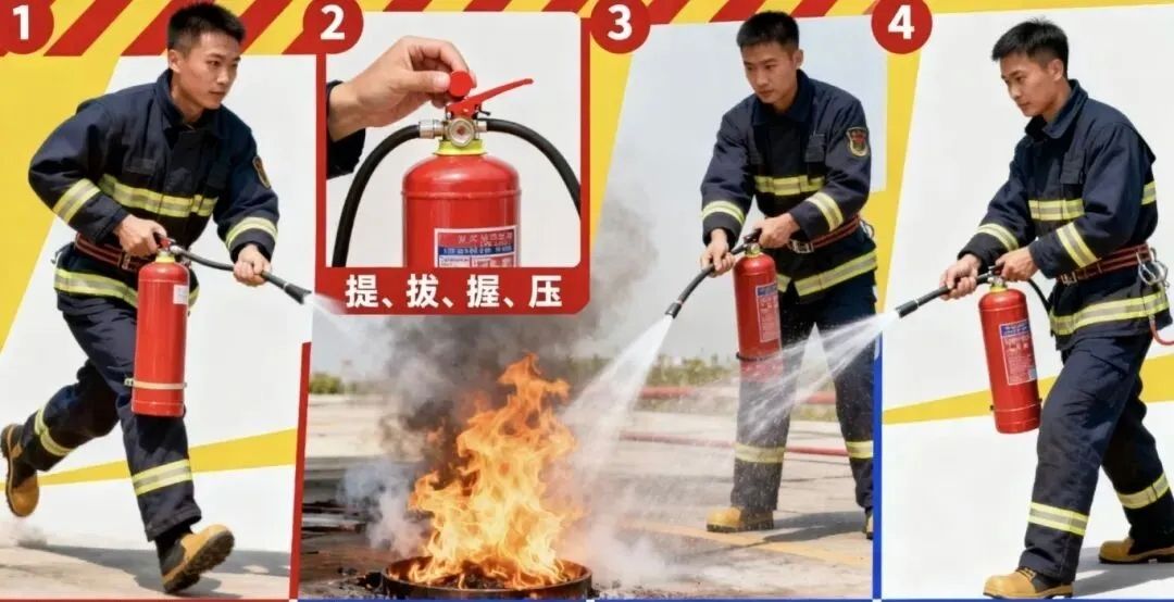 1. 提:提起灭火器,快速奔赴火源上风位置(距离火源3-5米);