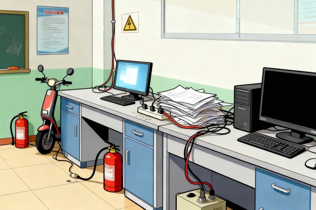 3.教室/办公区:放学后未关闭电脑、投影仪、空调等电器;插线板长期通电且堆放纸张等可燃物;私拉电线给电动车充电。