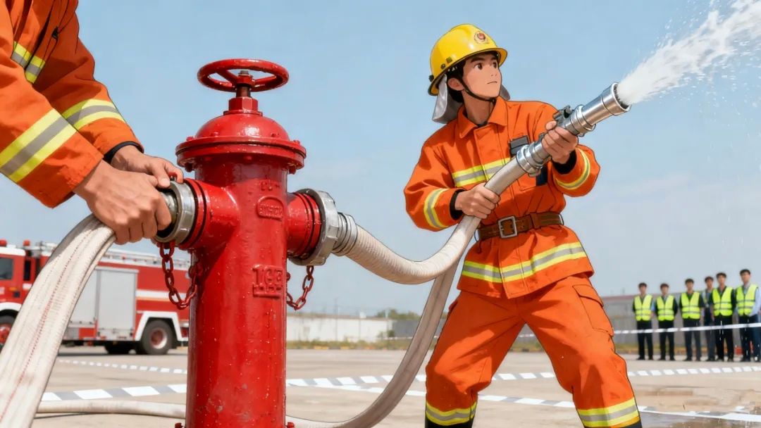 1. 一人快速打开消防栓箱门,连接水带与消防栓接口,确保接口拧紧不漏水;