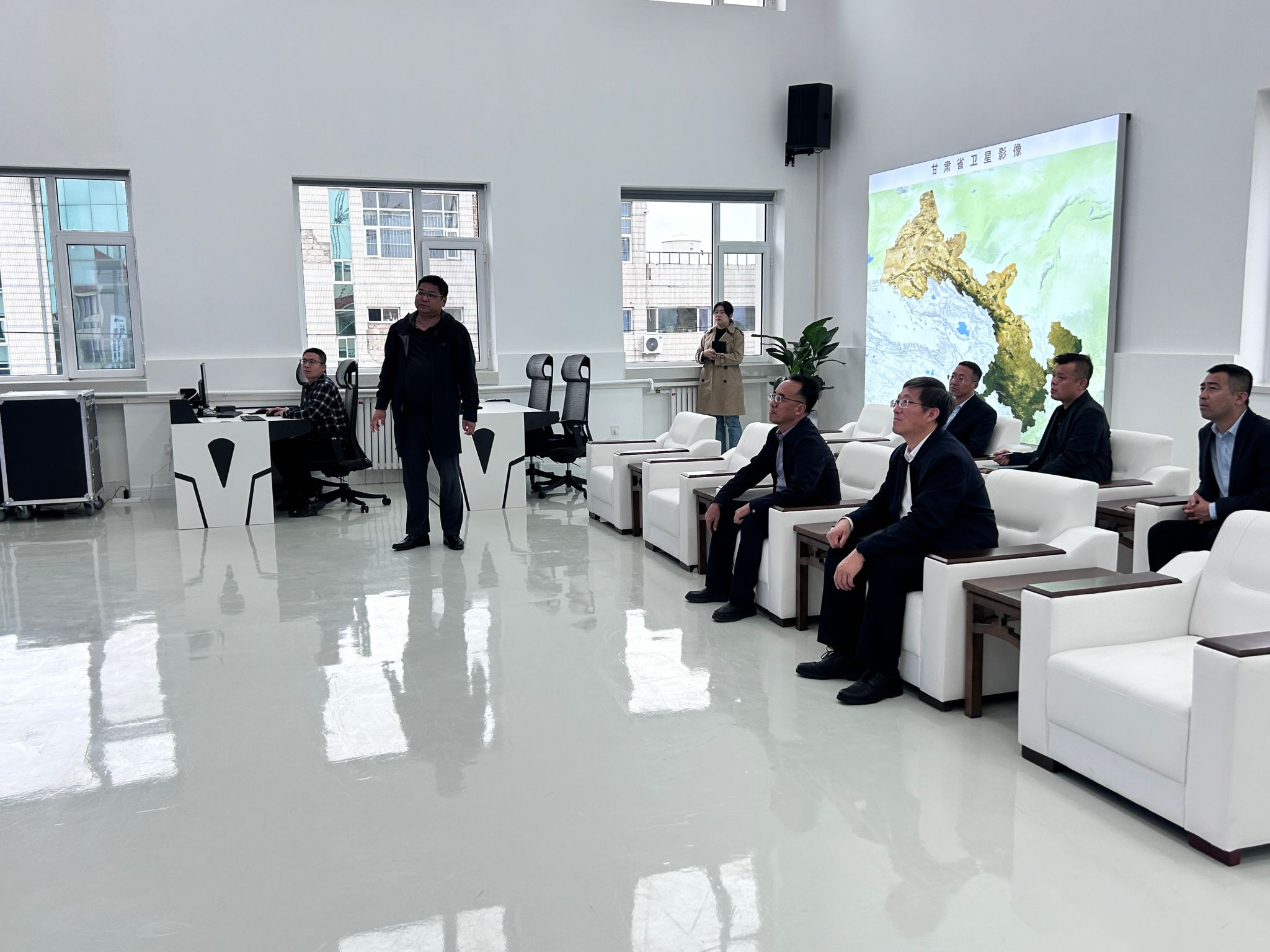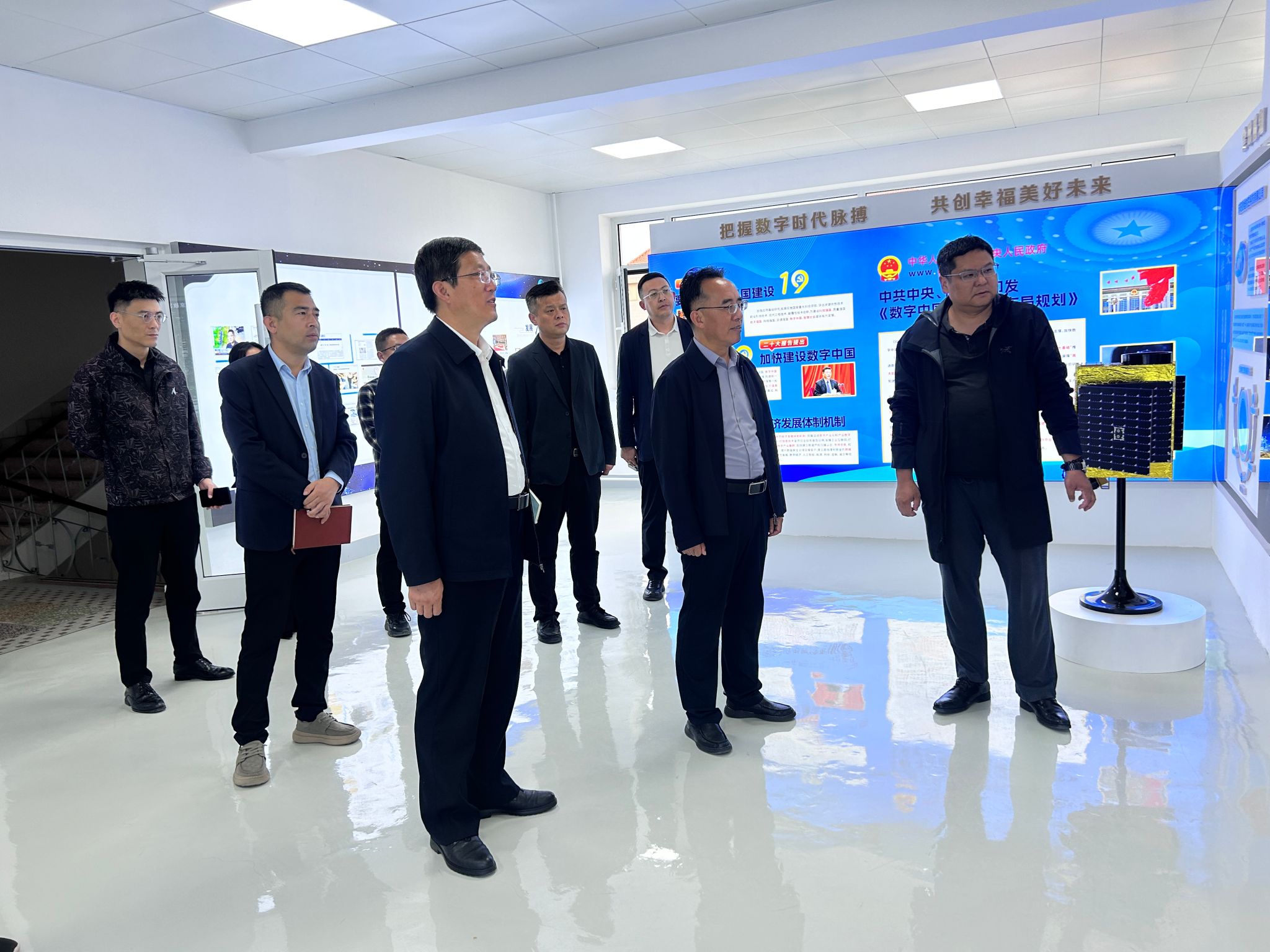 张建军一行先后参观了企业成果展厅、全球卫星遥感数据交易结算中心指挥大厅。陕西宝塔星空航天科技有限公司总经理王敬华详细介绍了企业核心技术成果、主要业务场景及庆阳全球卫星遥感数据交易结算中心、国家数据标注基地、国家数字经济创新孵化基地项目建设规划等。他表示将积极与学院对接建立校企合作关系,充分发挥企业在数字经济领域的生态优势,助力全市和学院数字经济人才培养与产业生态构建。
