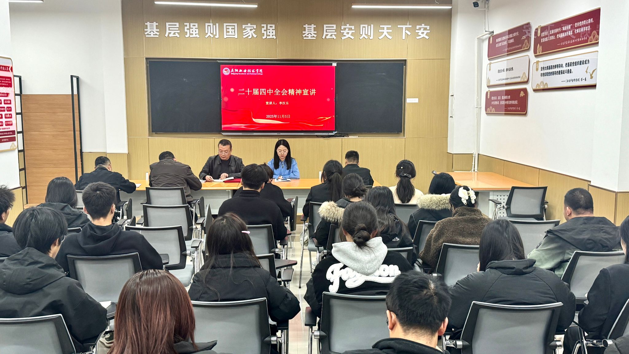 根据院党委部署,马克思主义学院安排,11月5日,公共管理系党支部开展二十届四中全会精神宣讲活动,马克思主义学院李汉乐老师做主题宣讲,公共管理系全体教职工、入党积极分子、班团干部60余人参加,活动由党支部书记帅勇刚主持。