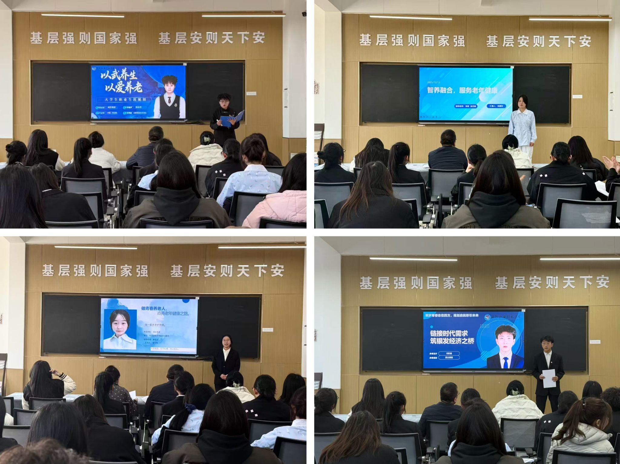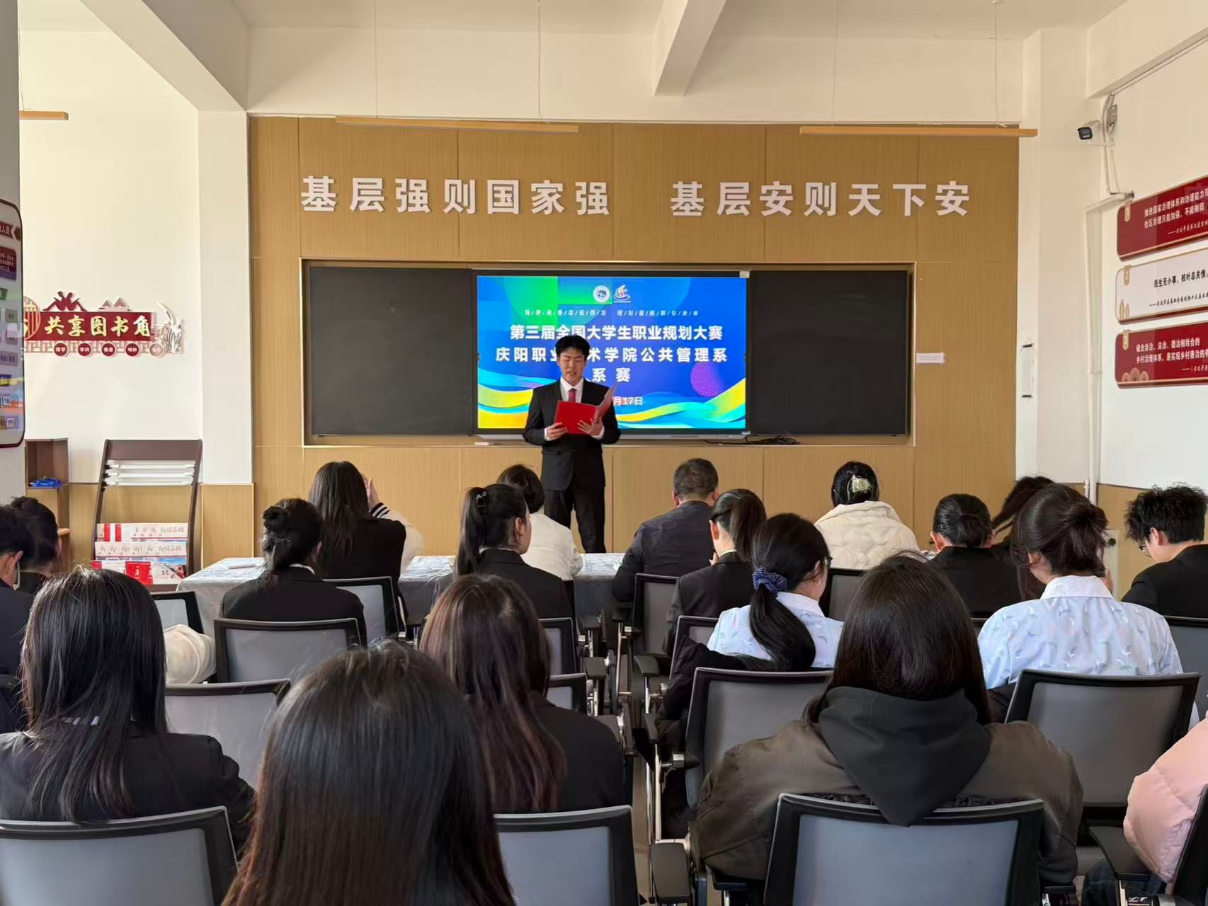 职业成就人生,规划指引未来,12月17日,庆阳职业技术学院公共管理系举办了第三届全国大学生职业规划大赛系部选拔赛,评委教师、参赛学生、观摩学生共计40余人参加本次活动,党支部书记帅勇刚主持活动,比赛分为成长赛道与就业赛道展开。
