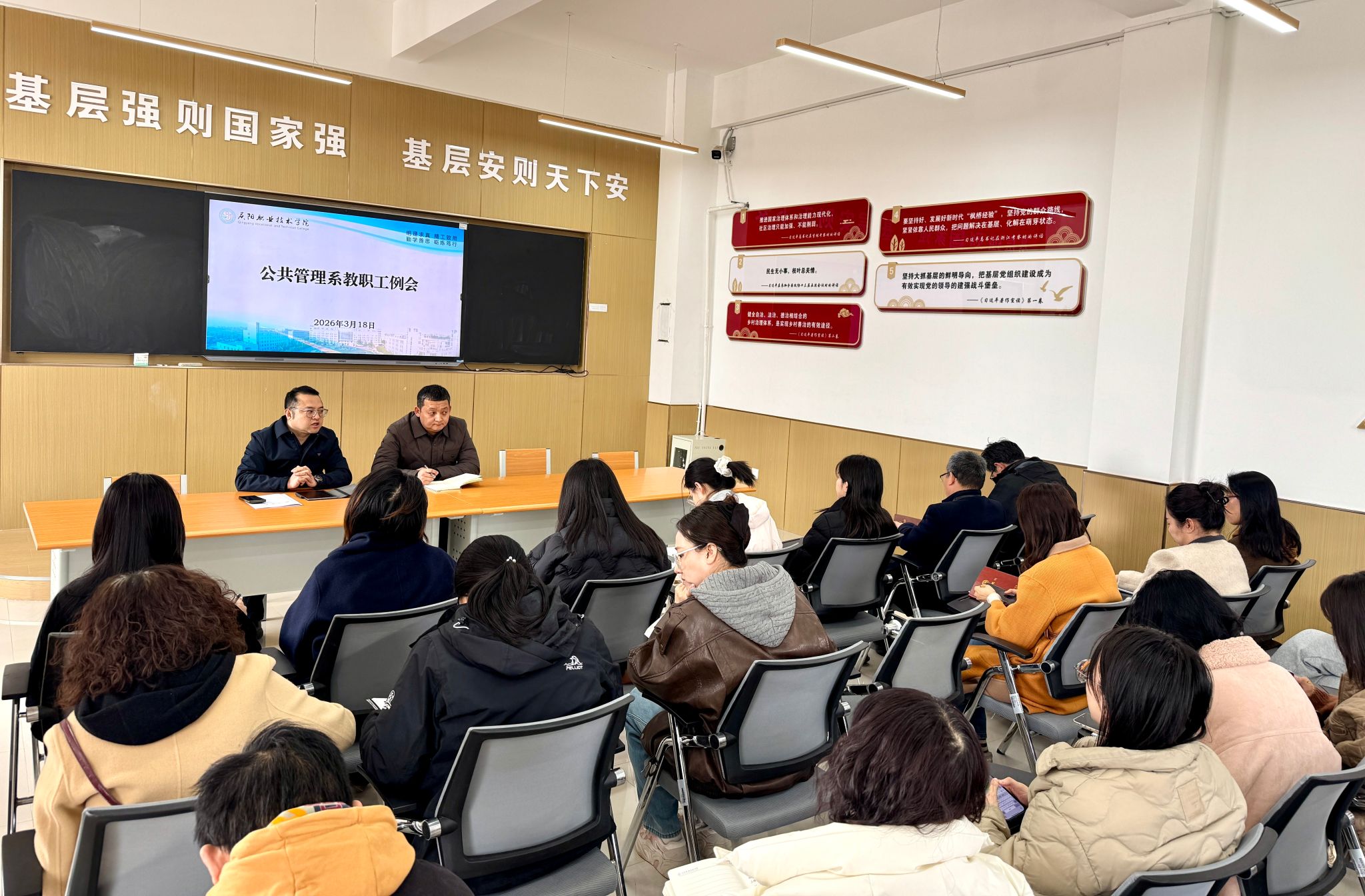 3月18日,公共管理系召开全体教职工会议,系主任李剑领学教育部《关于深化职业教育教学关键要素改革的意见》文件精神,引导教师把握职业教育改革新形势,积极投身教学改革实践,以高质量教学支撑系部内涵建设与特色发展。