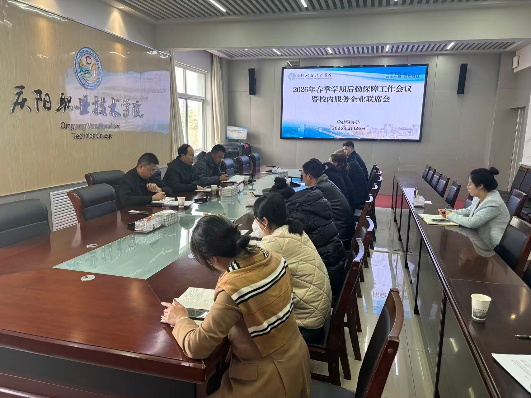 春潮涌动启新程,凝心聚力强保障。为切实筑牢后勤服务保障防线,规范校内服务企业管理,压实安全责任,确保开学各项工作平稳有序推进,2月26日下午,后勤服务处组织召开2026年春季学期后勤保障工作会暨校内服务企业联席会。后勤服务处、安全管理处、各校内服务企业负责人参加会议。会议由后勤服务处处长邵吉庆主持。会上,王棋组织全体参会人员学习《学院校内服务企业管理办法》,重点解读了办法中关于企业准入、服务规范、考核评价、...