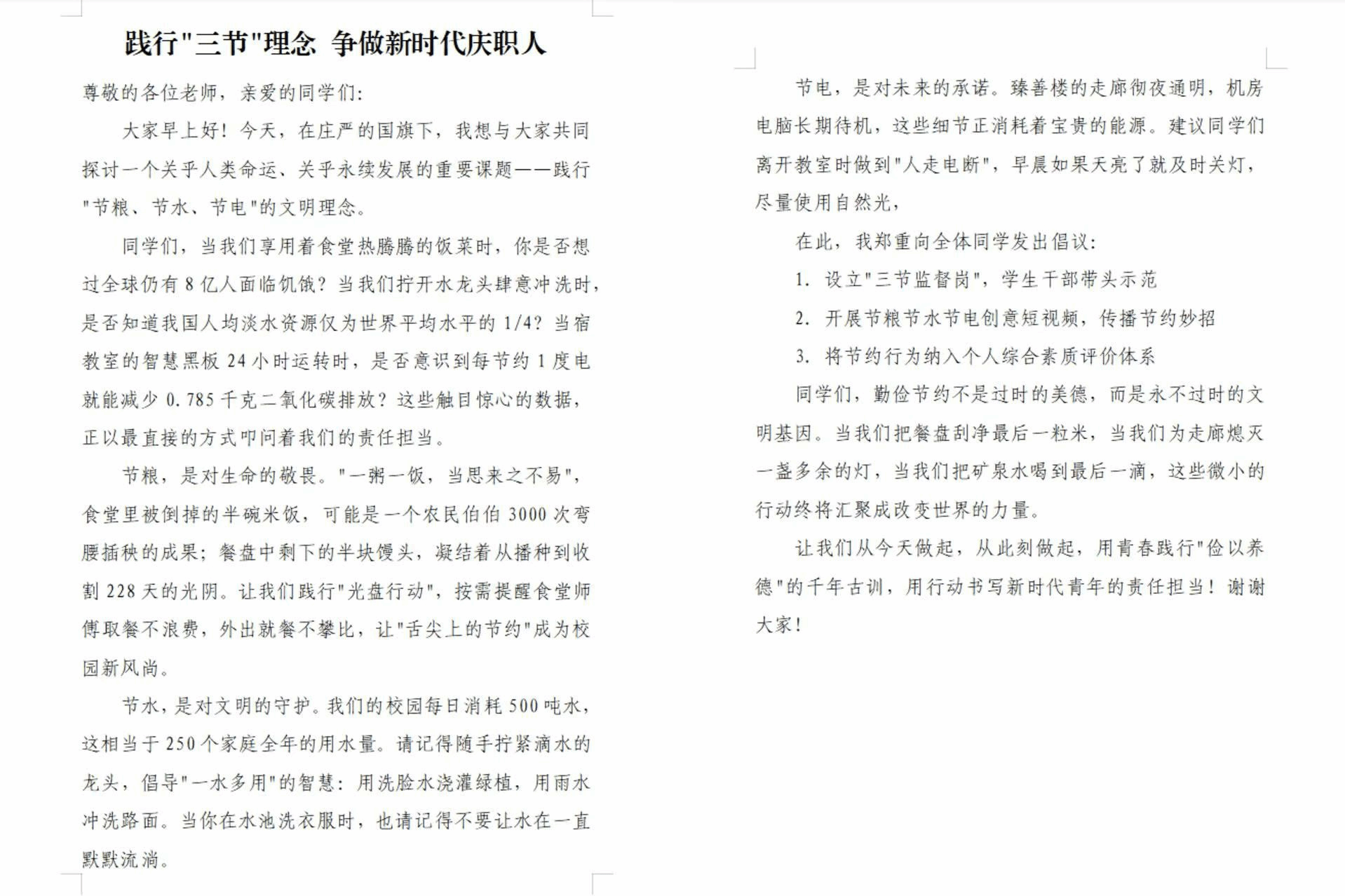 在活动开展过程中,学院举办国旗下主题教育活动,学生代表发表主题演讲,向全体师生发出“节水、节粮、节电”倡议,号召大家珍惜每一滴水、每一粒粮、每一度电。各班积极开展“节水、节粮、节电”主题班会,探讨日常生活中的浪费现象及改进措施。同时利用毓秀湖及臻善楼大屏播放公益宣传视频和“三节”标语,向师生展示资源浪费的危害以及节约资源的方法和意义。