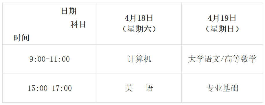 (四)考试时间。全省统一考试时间为4月18日、19日。具体考试时间与考试科目安排如下(北京时间):