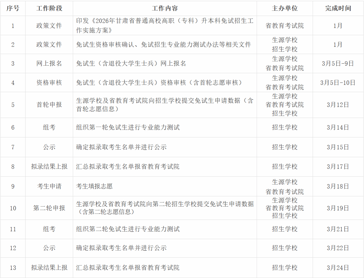 2026年甘肃省普通高校高职(专科)升本科免试招生工作进程表