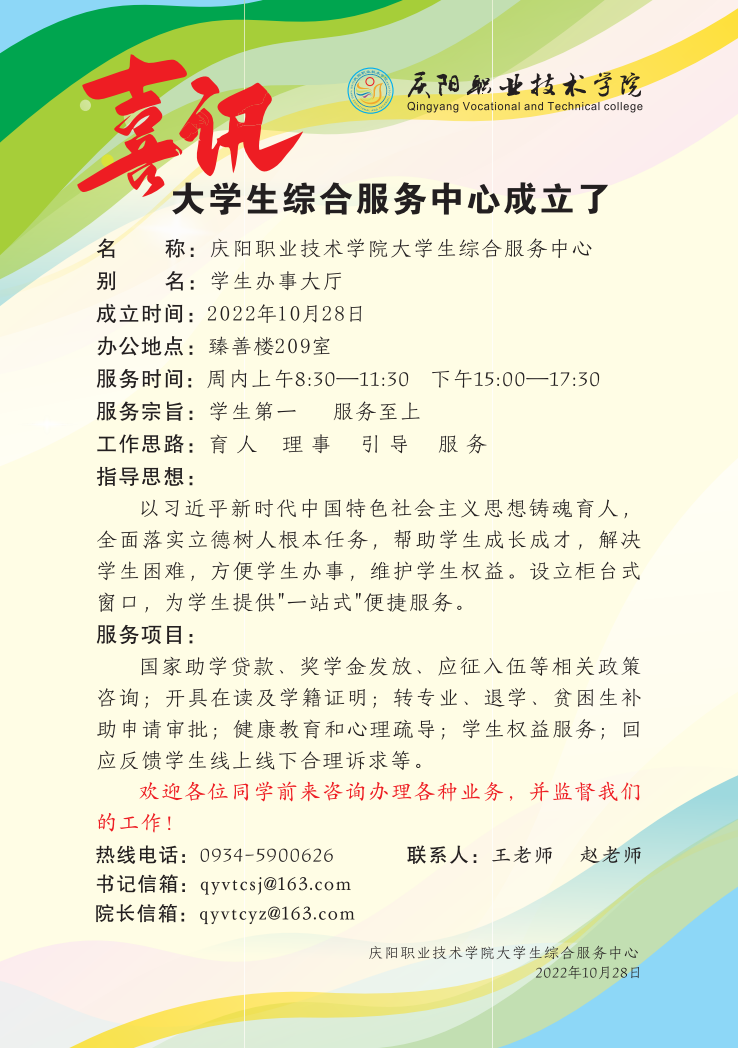 据悉,大学生综合服务中心成立以后,将陆续入驻学工处、教务处、资助中心、后勤㢟、招生就业处等多个部门。拟设置四个柜台,承接国家助学贷款、奖学金发放、应征入伍等相关政策咨询,开具在读及学籍证明,转专业、退学、贫困生补助申请审批,健康教育和心理疏导,学生权益服务等多个服务项目,回应反馈学生线上线下合理诉求。本着“学生第一、服务至上”的服务宗旨,兼具“育人、理事、引导、服务”功能,将管理下沉至一线,将服务送到师生身边,为全校学生提供校园学生生活相关事务办理的“一站式”便捷服务。