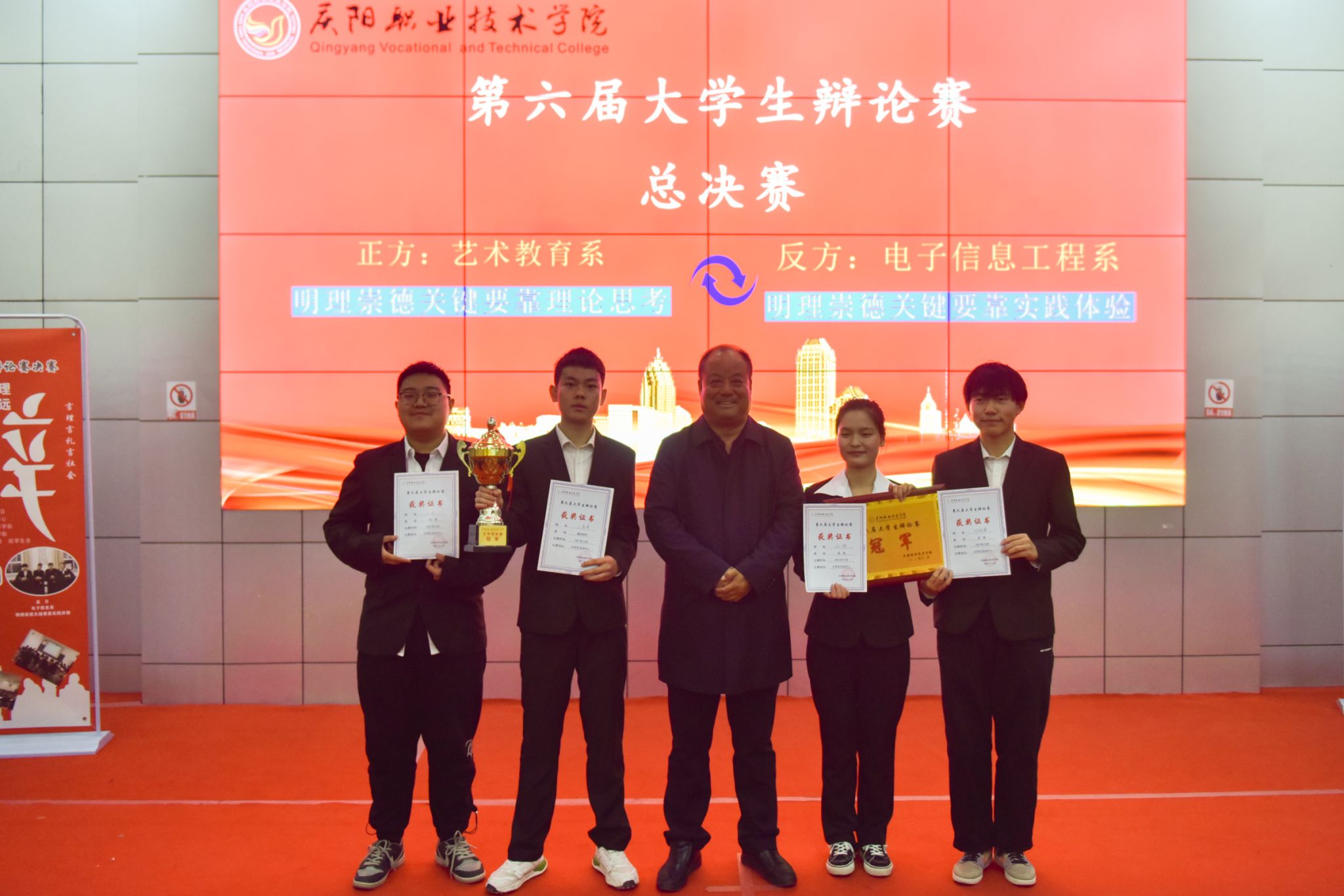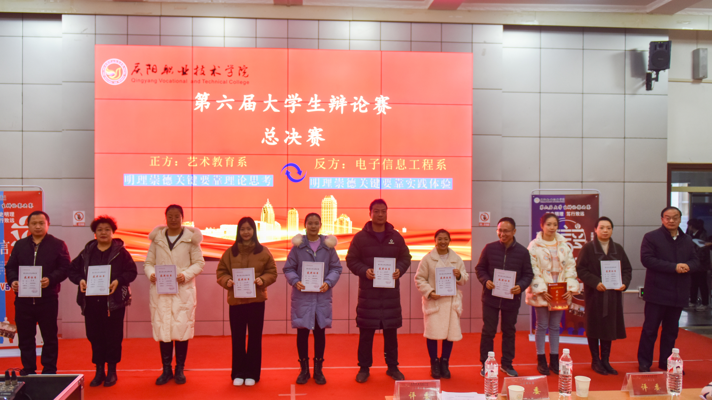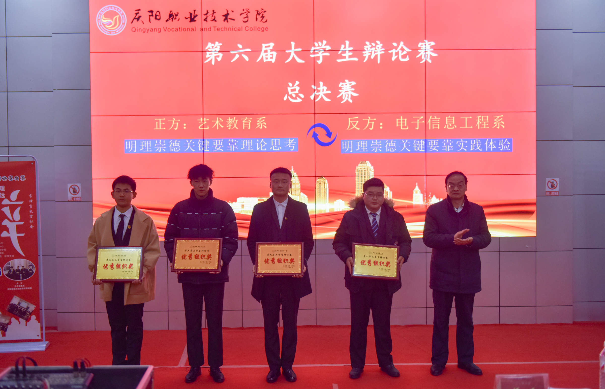 为了庆祝中国共产党成立100周年,积极开展党史学习教育活动,加强素质教育,培养学生的语言表达能力、逻辑思维能力和团队协作意识,庆阳职业技术学院第六届大学生辩论赛于12月7日下午在大学生活动中心举行总决赛暨颁奖典礼。院党委副书记、院长张武德,党委委员、副院长曹强、白旭宁出席,有关处室、系部领导和师生代表参加总决赛暨颁奖典礼。