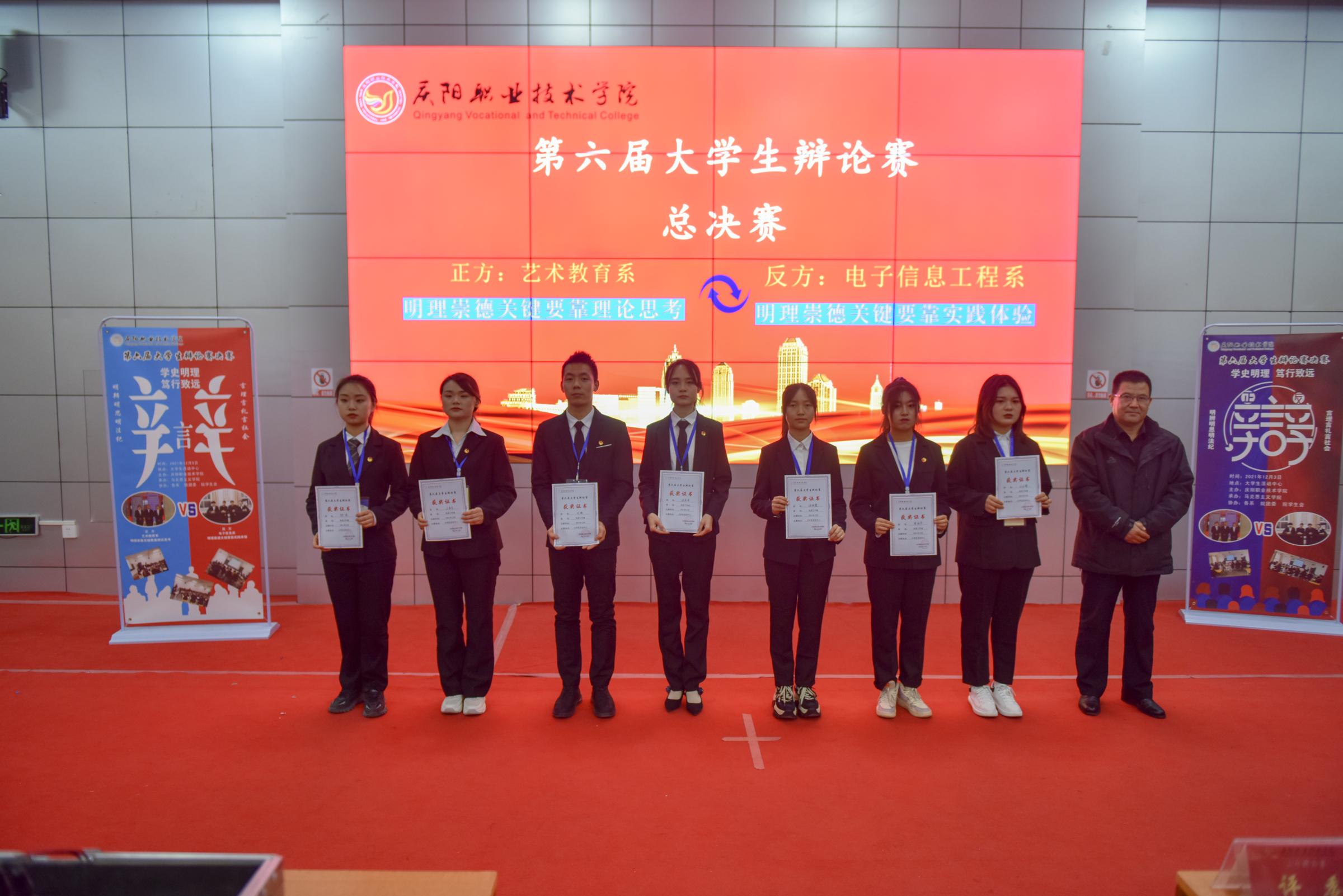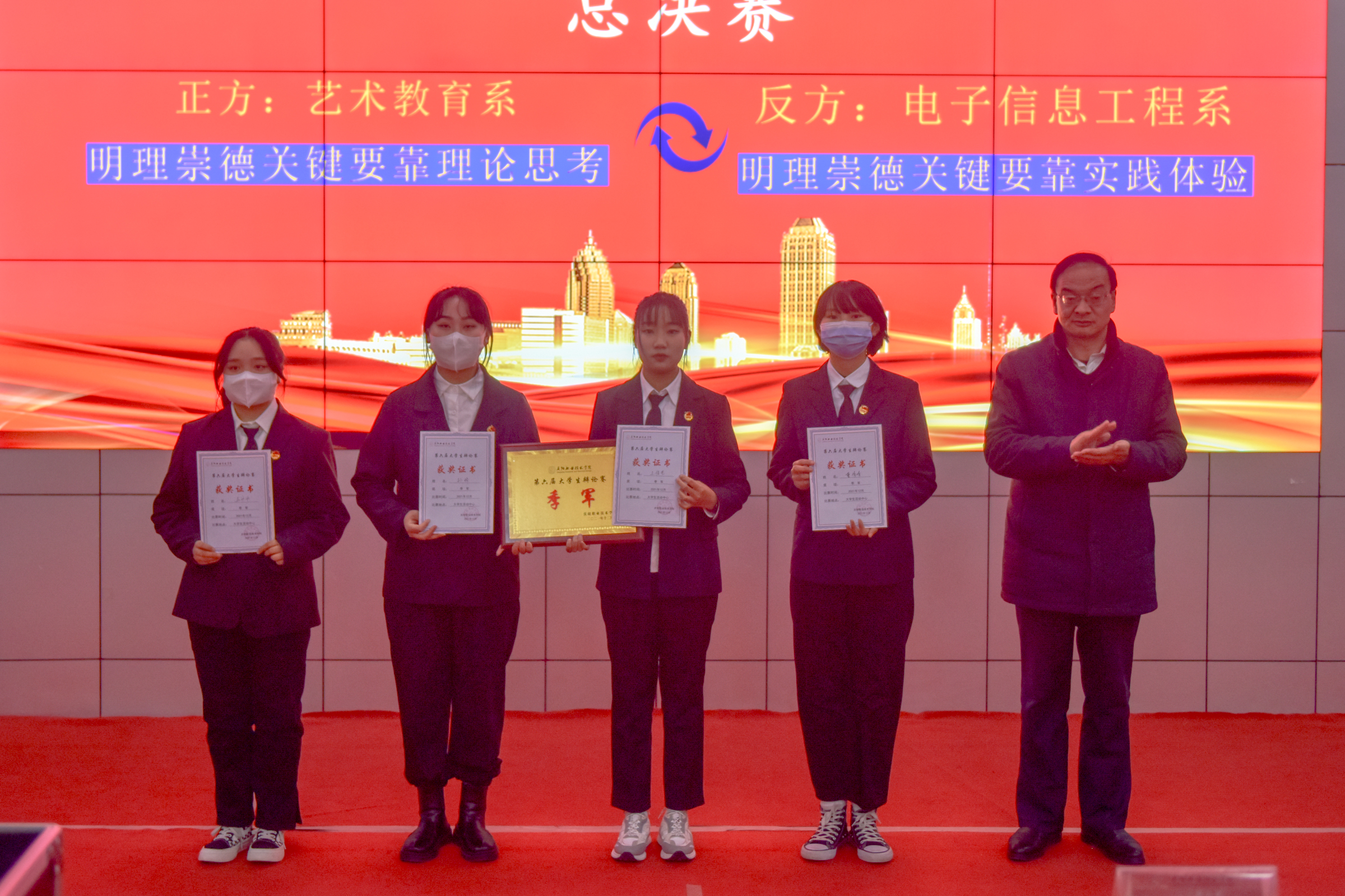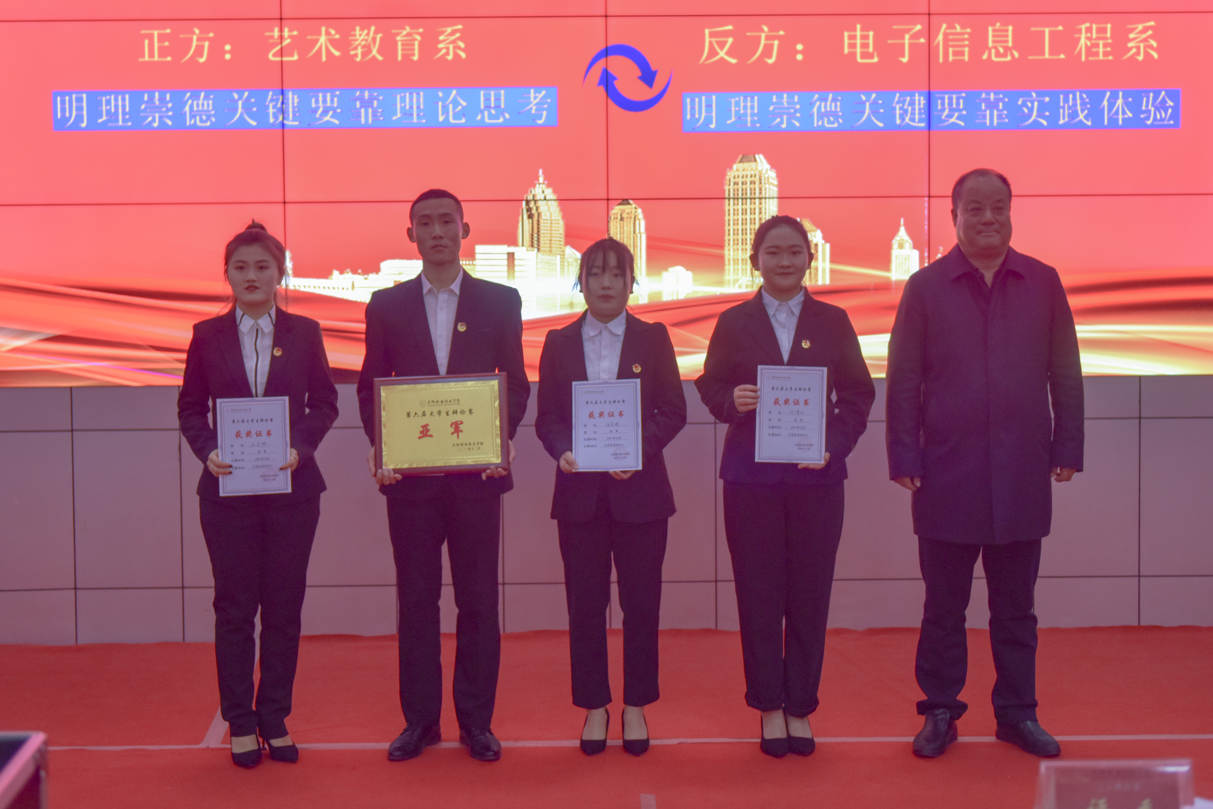 学院7个系代表队经过为期两个多月初赛、复赛、半决赛的激烈角逐,最终电子信息工程系、艺术教育系两支参赛队进入总决赛。两系代表队的冠军争夺,为广大师生奉献了一场精彩纷呈的思辨盛宴。双方从观点鲜明的开篇立论、据理力争的攻辩、唇枪舌战的自由辩论到慷慨激昂的总结陈词,都展示了辩手们的敏捷思维和机智应答的个人风采,比赛因此高潮迭起,热心观众的提问,也让整场辩论赛气氛更加欢快热烈。经过激烈辩论,电子信息工程系获得本届辩论赛冠军,艺术教育系获亚军,经济管理系获季军,权盈瑞等四名同学获最佳辩手称号。