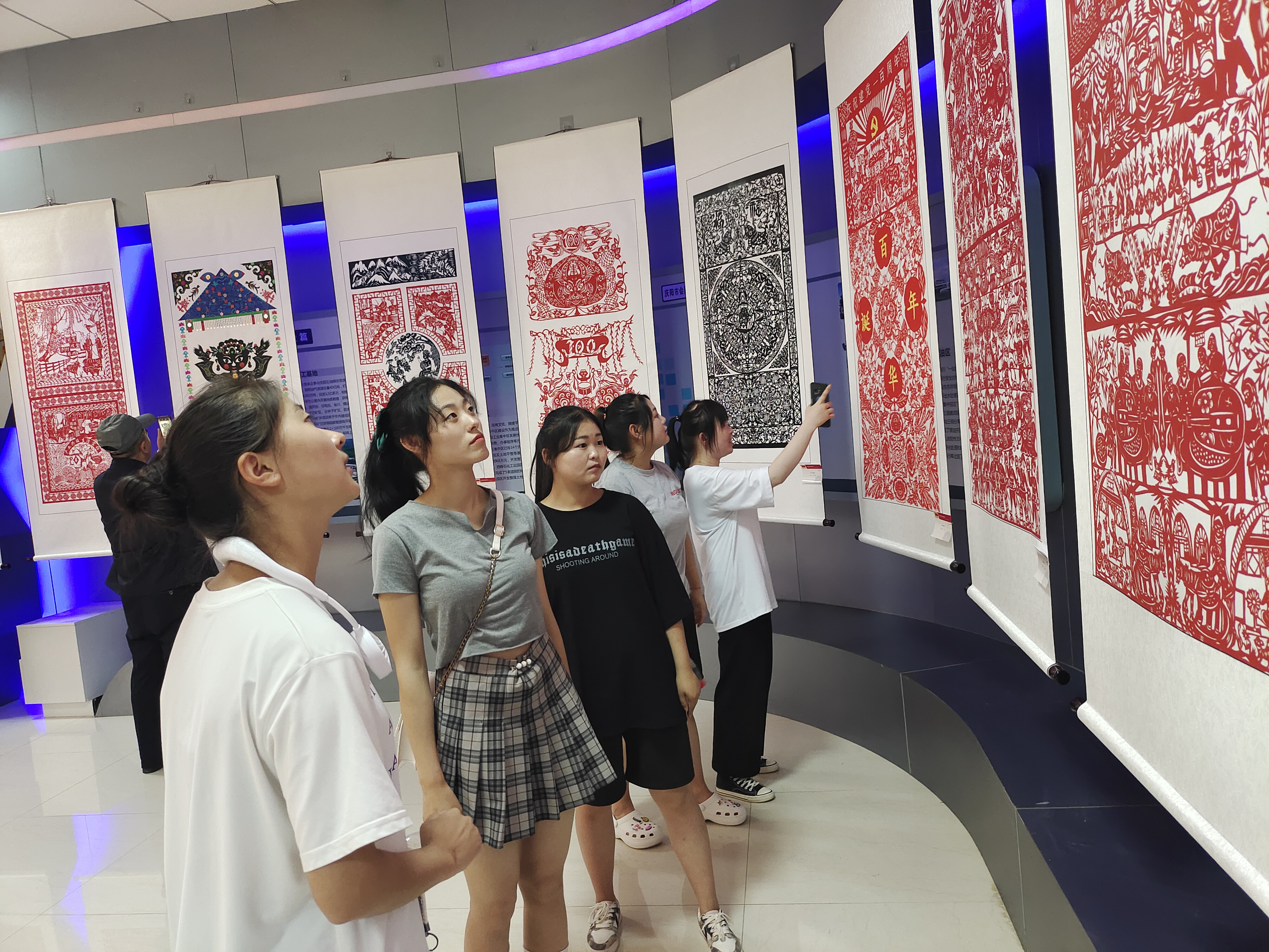在展览厅,同学们津津有味地欣赏92位作者的109件(组)138幅剪纸作品和80多件庆阳香包、刺绣、泥塑等民间艺术品。这些寓意丰富、形式多样的作品,生动形象地表现了乡村振兴、红色文化、小康生活、农耕文化、民俗文化等主题,表达了新时代广大劳动者热爱中国共产党、热爱祖国的深厚情怀和积极向上、勇于创造的精神风貌,反映了中国共产党领导人们在奋进社会主义现代化建设的新征程中取得的伟大成就,折射出人民群众对中华民族伟大复兴的中国梦的坚定自信和无限憧憬。