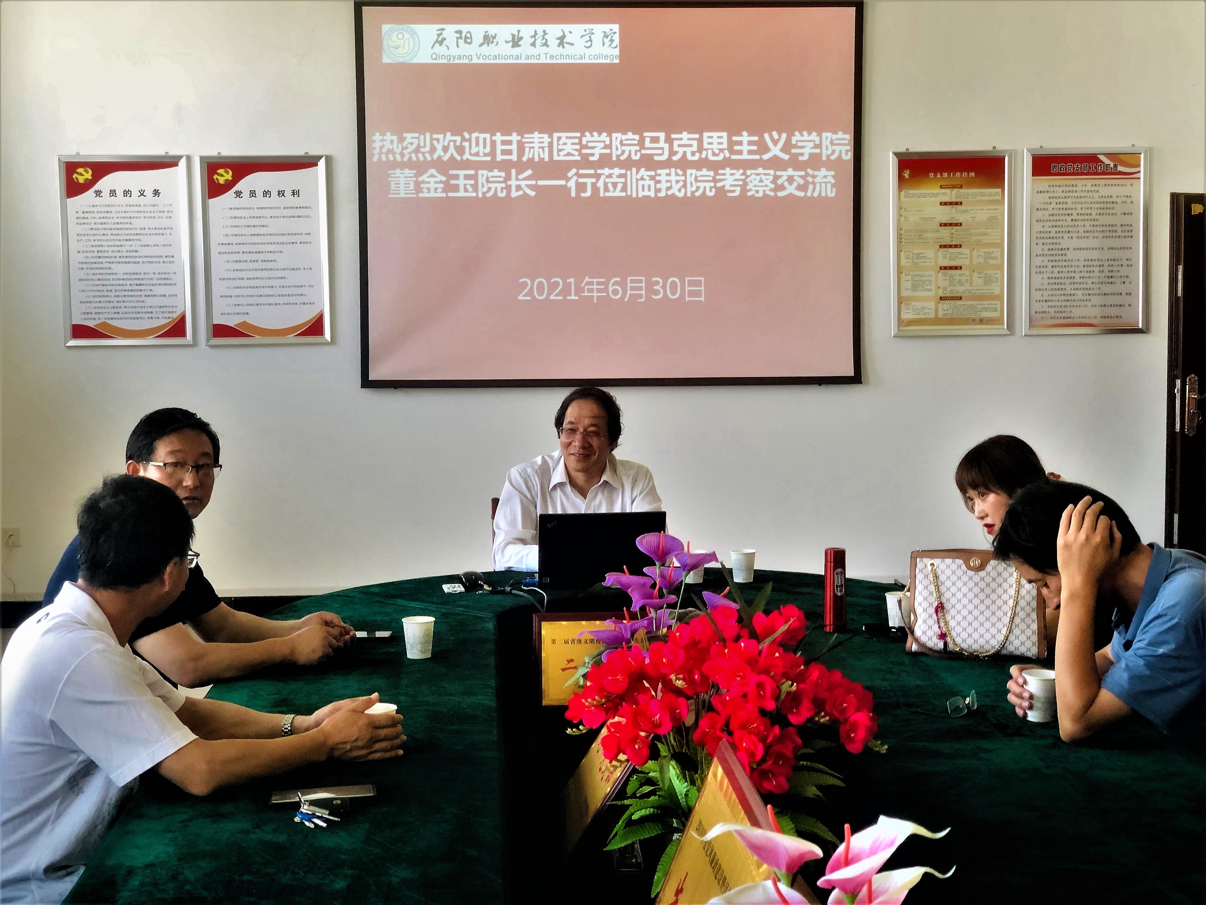 6月30日上午,甘肃医学院马克思主义学院党支部书记、常务副院长、高教管理研究员董金玉、青年教师朱章芳博士、吴吉能硕士一行莅临学院调研马克思主义学院及思政课建设情况。
