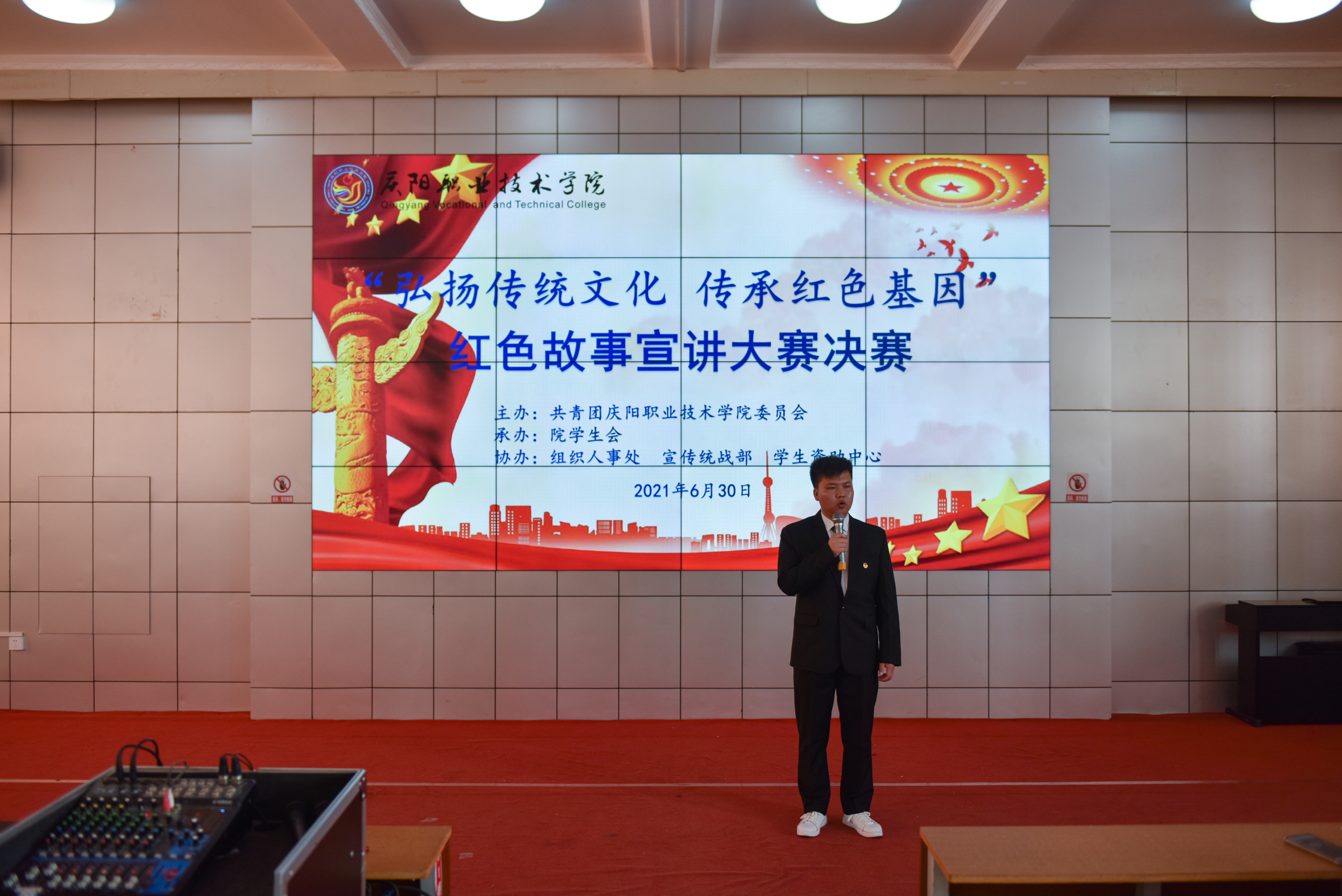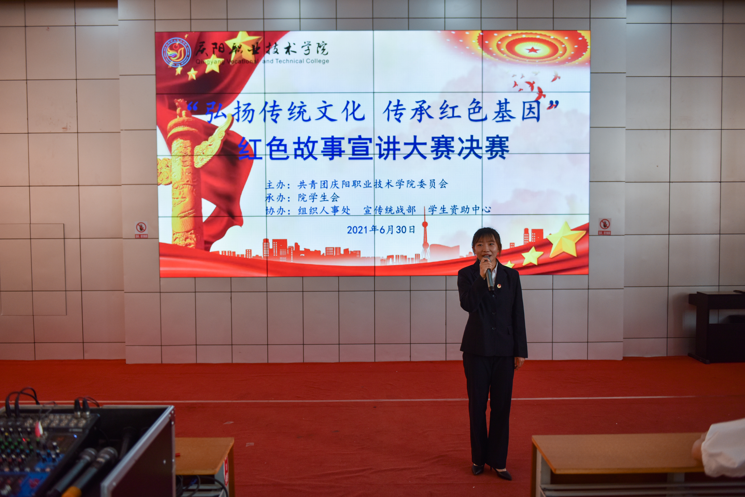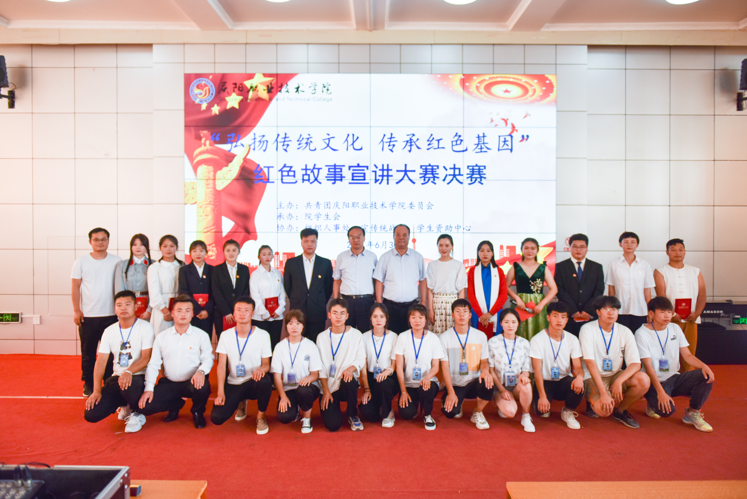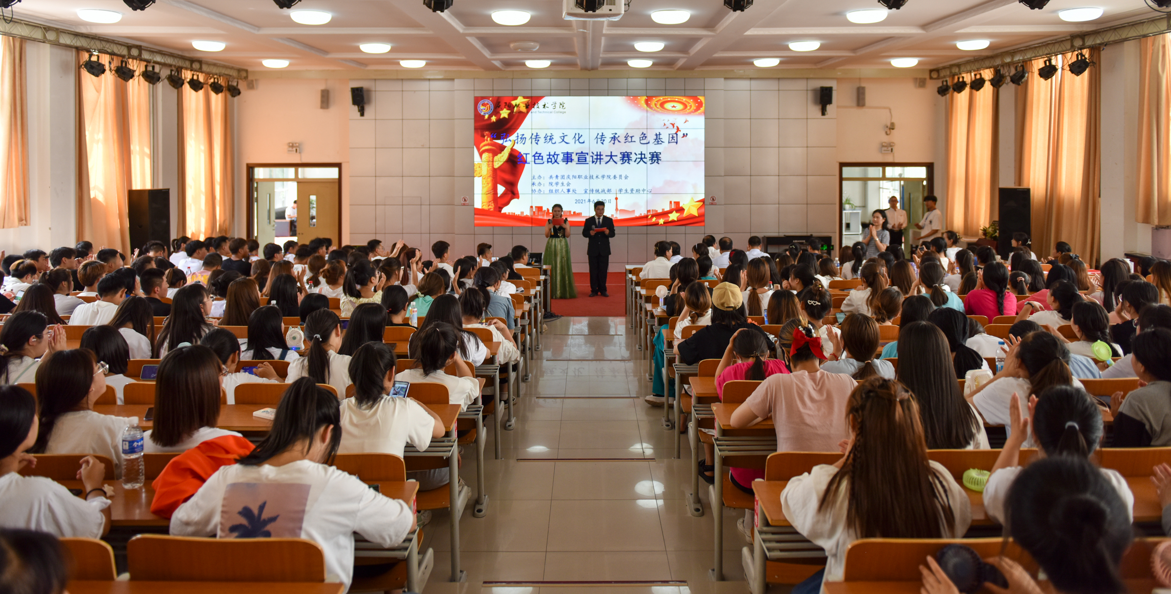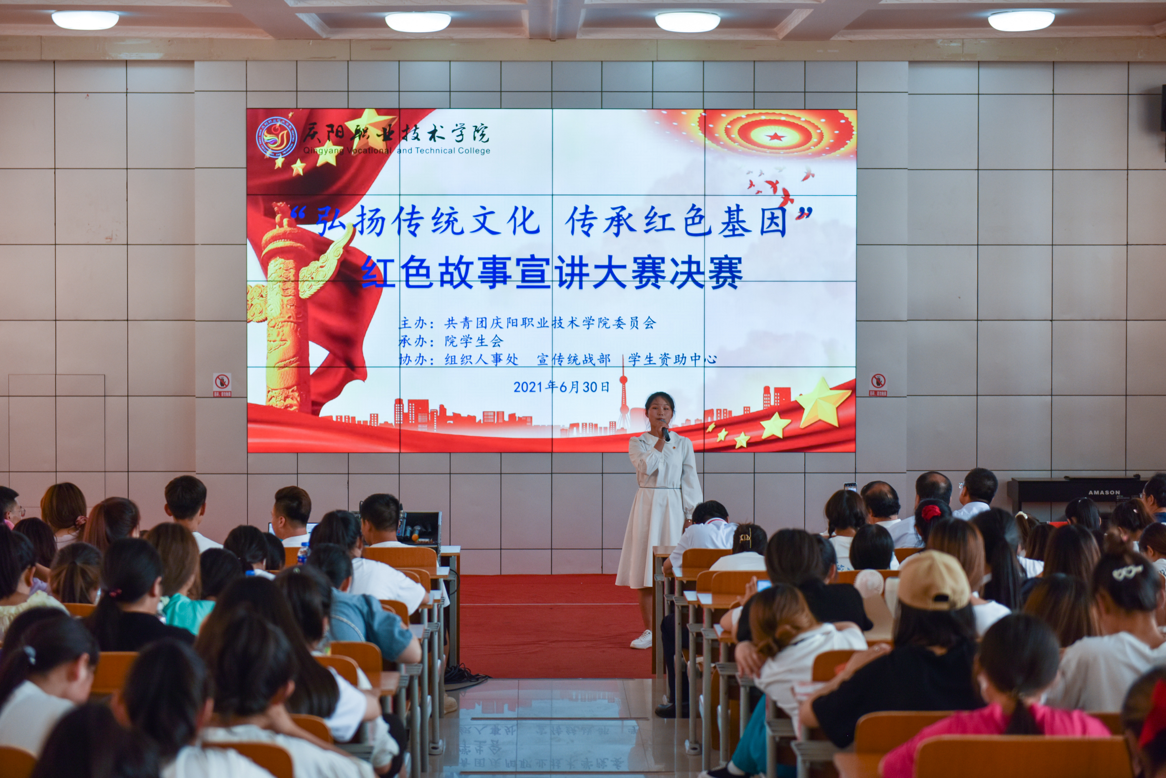 为庆祝中国共产党成立100周年,引领广大青年感受党的百年光辉历程、百年伟大成就,营造富有激情、富有青春气息的校园文化氛围,展现当代大学生风采,增强大学生爱党爱国情怀。6月30日下午,学院“弘扬传统文化 传承红色基因”红色故事宣讲大赛在大学生活动中心举行。院党委副书记、院长张武德,党委委员、副院长白旭宁出席活动,马克思主义学院院长刘鹏辉、马克思主义学院党支部书记罗伟、学生资助中心主任张亚凤、基础教学部副主任张宏、经济管理系副主任帅勇刚担任比赛评委。院团委班子成员、各系分管团学工作副主任、团总支书记及学生代表共计350余人参加。