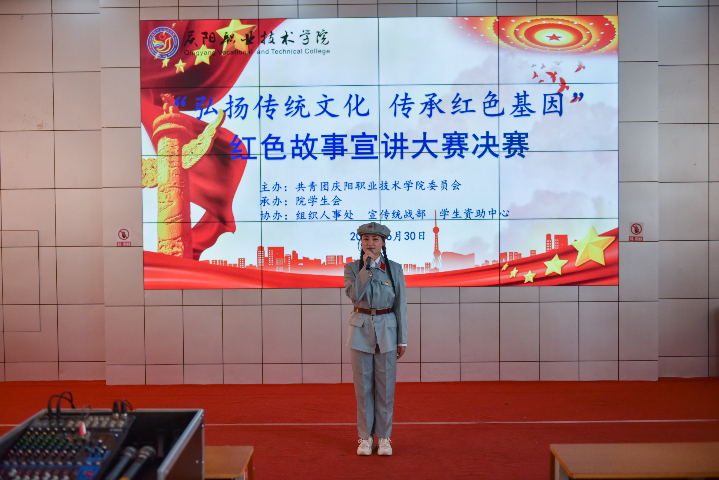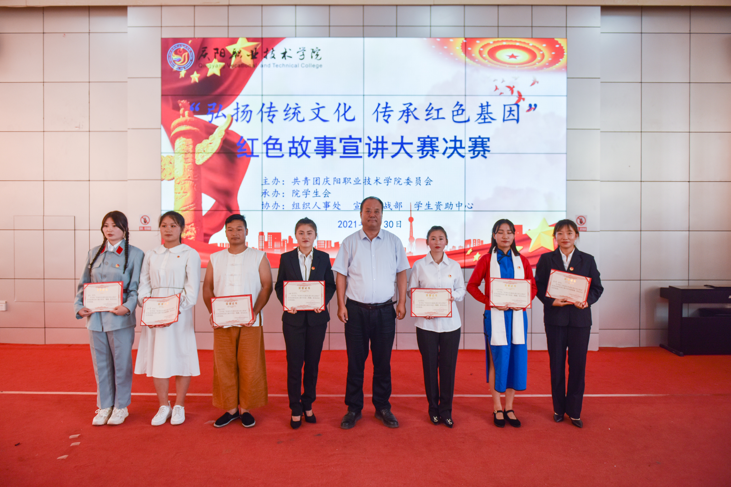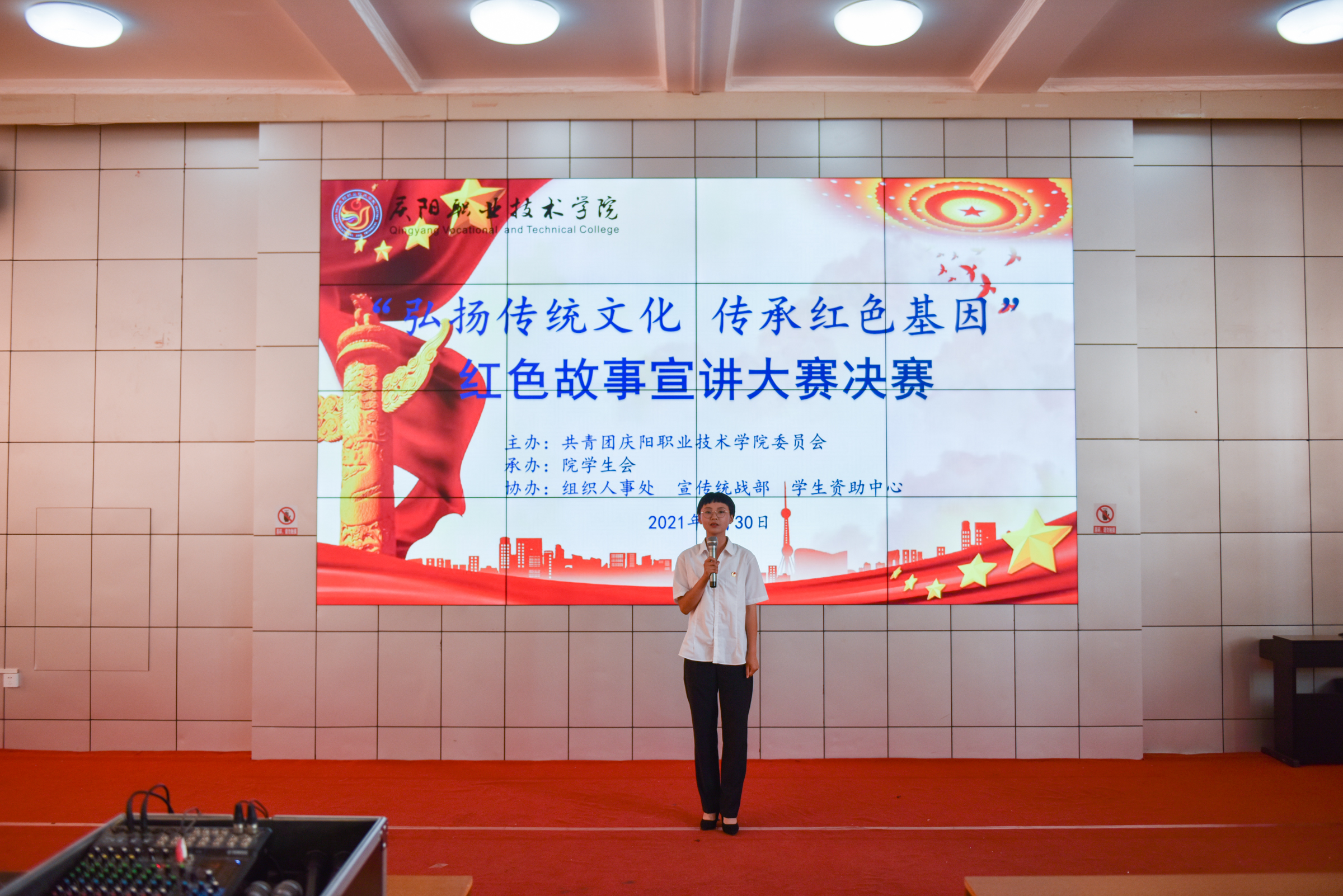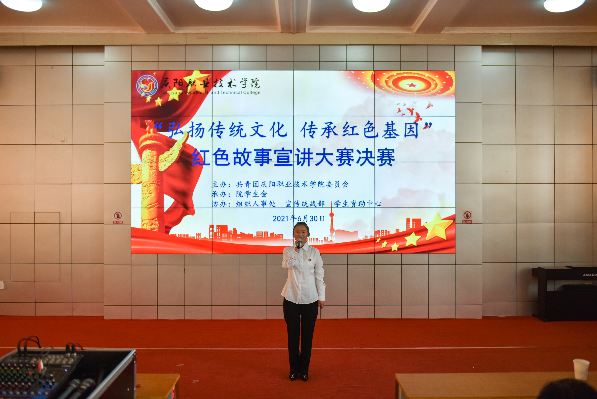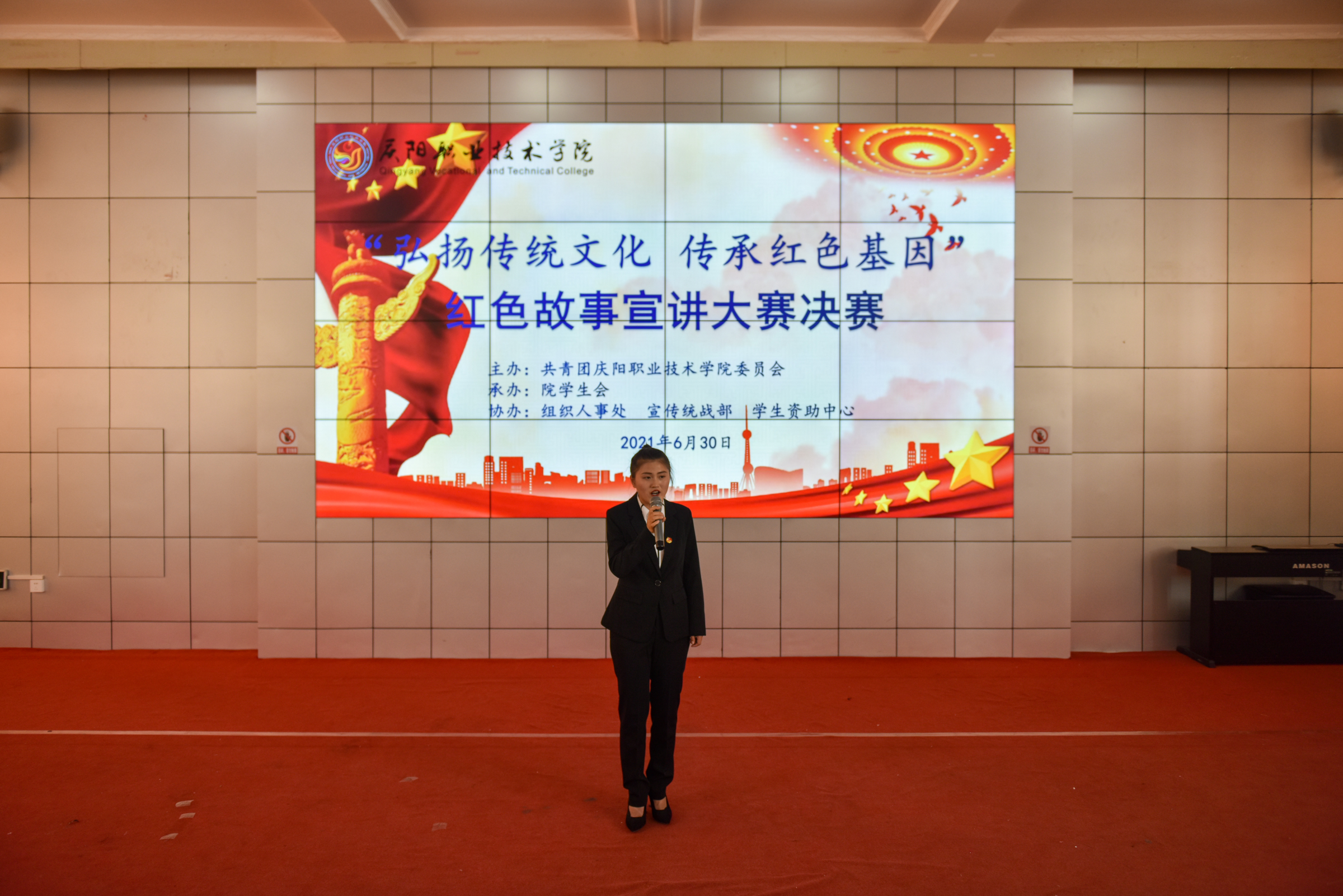 为庆祝中国共产党成立100周年,引领广大青年感受党的百年光辉历程、百年伟大成就,营造富有激情、富有青春气息的校园文化氛围,展现当代大学生风采,增强大学生爱党爱国情怀。6月30日下午,学院“弘扬传统文化 传承红色基因”红色故事宣讲大赛在大学生活动中心举行。院党委副书记、院长张武德,党委委员、副院长白旭宁出席活动,马克思主义学院院长刘鹏辉、马克思主义学院党支部书记罗伟、学生资助中心主任张亚凤、基础教学部副主任张宏、经济管理系副主任帅勇刚担任比赛评委。院团委班子成员、各系分管团学工作副主任、团总支书记及学生代表共计350余人参加。