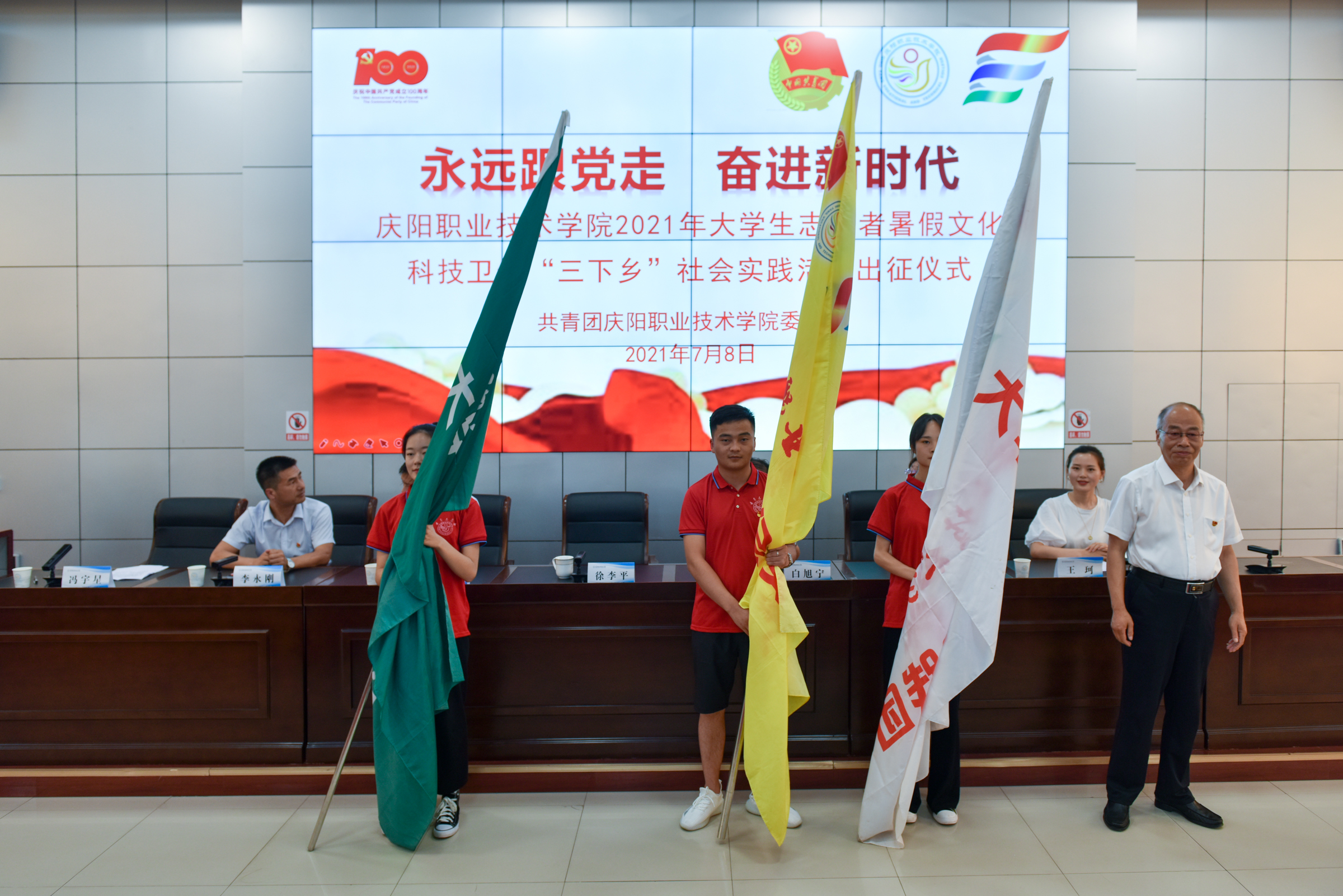 7月8日,我院在多媒体报告厅举行“永远跟党走、奋进新时代”庆阳职业技术学院2021年大学生志愿者暑期文化科技卫生“三下乡”社会实践活动出征仪式。党委书记徐李平,党委委员、副院长白旭宁出席,学院党政办公室、宣传统战部、学生工作处主要负责同志及院团委班子成员、各系主管团学工作副主任、系团总支书记、学生代表总计230余人参加。团委副书记冯宇星主持。
