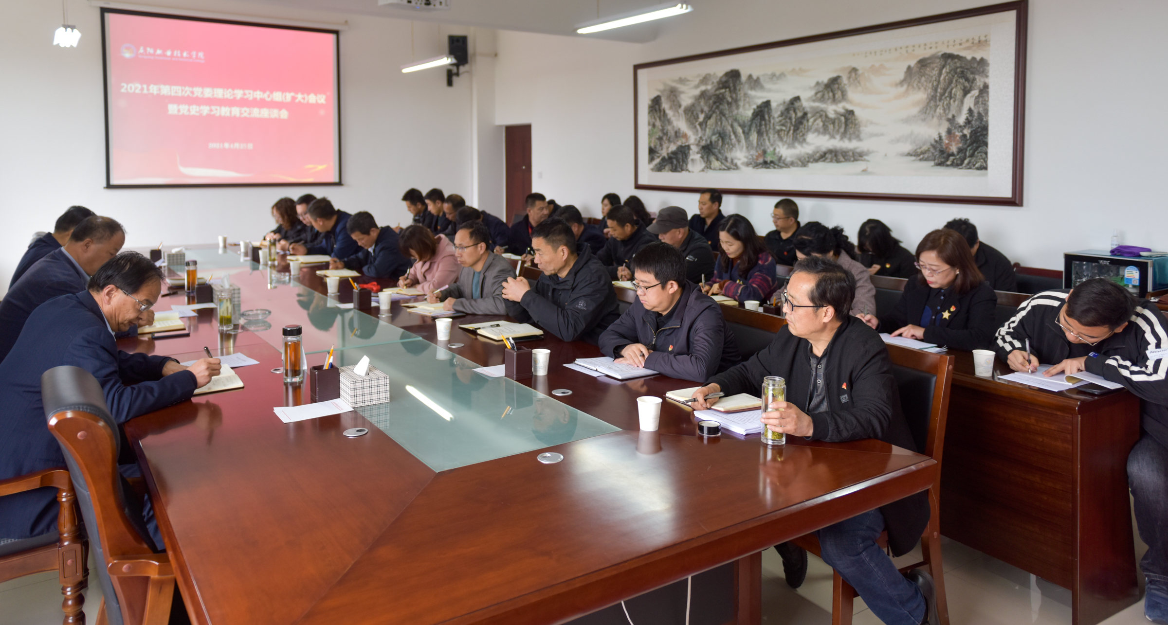 4月25日上午,庆阳职业技术学院召开2021年第四次党委理论学习中心组(扩大)会议暨党史学习教育交流座谈会,深入学习全国职业教育大会精神,并围绕贯彻落实习近平总书记重要指示精神和深化开展党史学习教育工作进行了主题发言。在家党委委员、各党支部书记、各部门负责人参加会议。党委副书记、院长张武德同志主持会议。