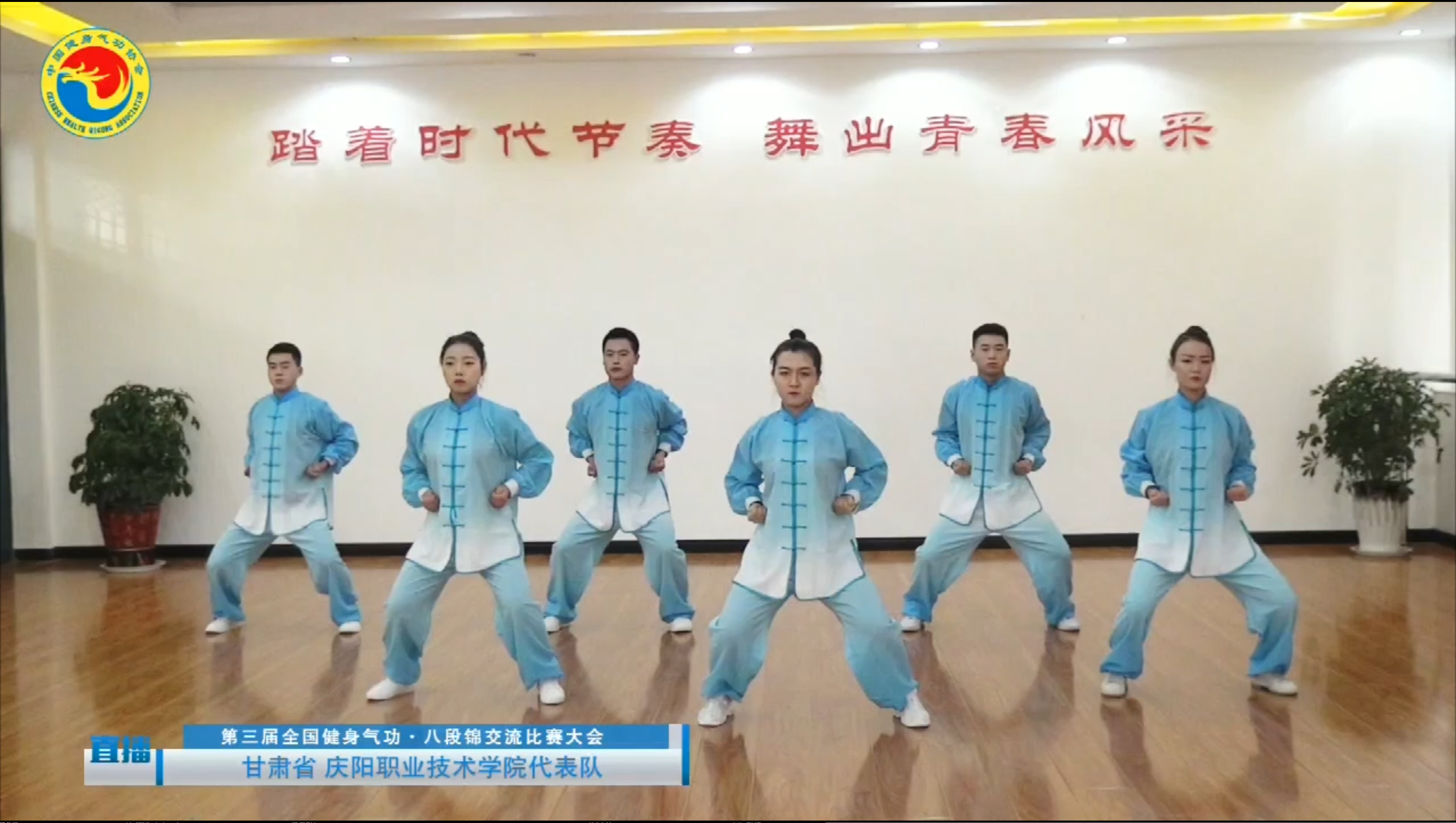12月20日上午9点,由国家体育总局健身气功管理中心、北京市体育局、北京市房山区人民政府主办的第三届全国健身气功·八段锦交流比赛大会在北京市房山区举行。庆阳职业技术学院代表队作为甘肃省三支参赛队伍之一,通过视频直播的方式,与北京主会场大屏幕现场连线进行比赛。经过精心准备、刻苦训练,庆阳职业技术学院代表队最终在全国32支线上代表队中取得第21名的好成绩,荣获此次比赛三等奖。