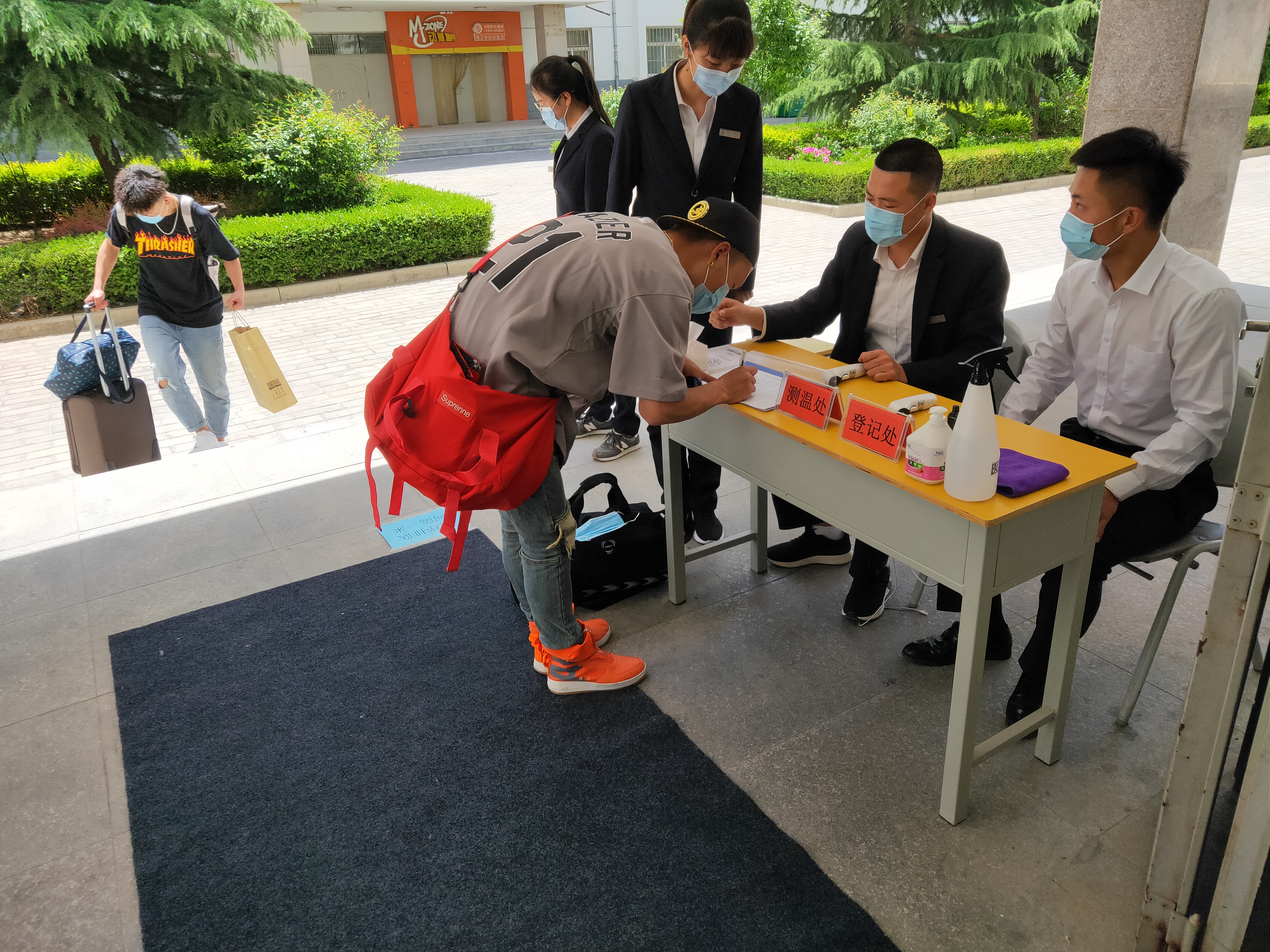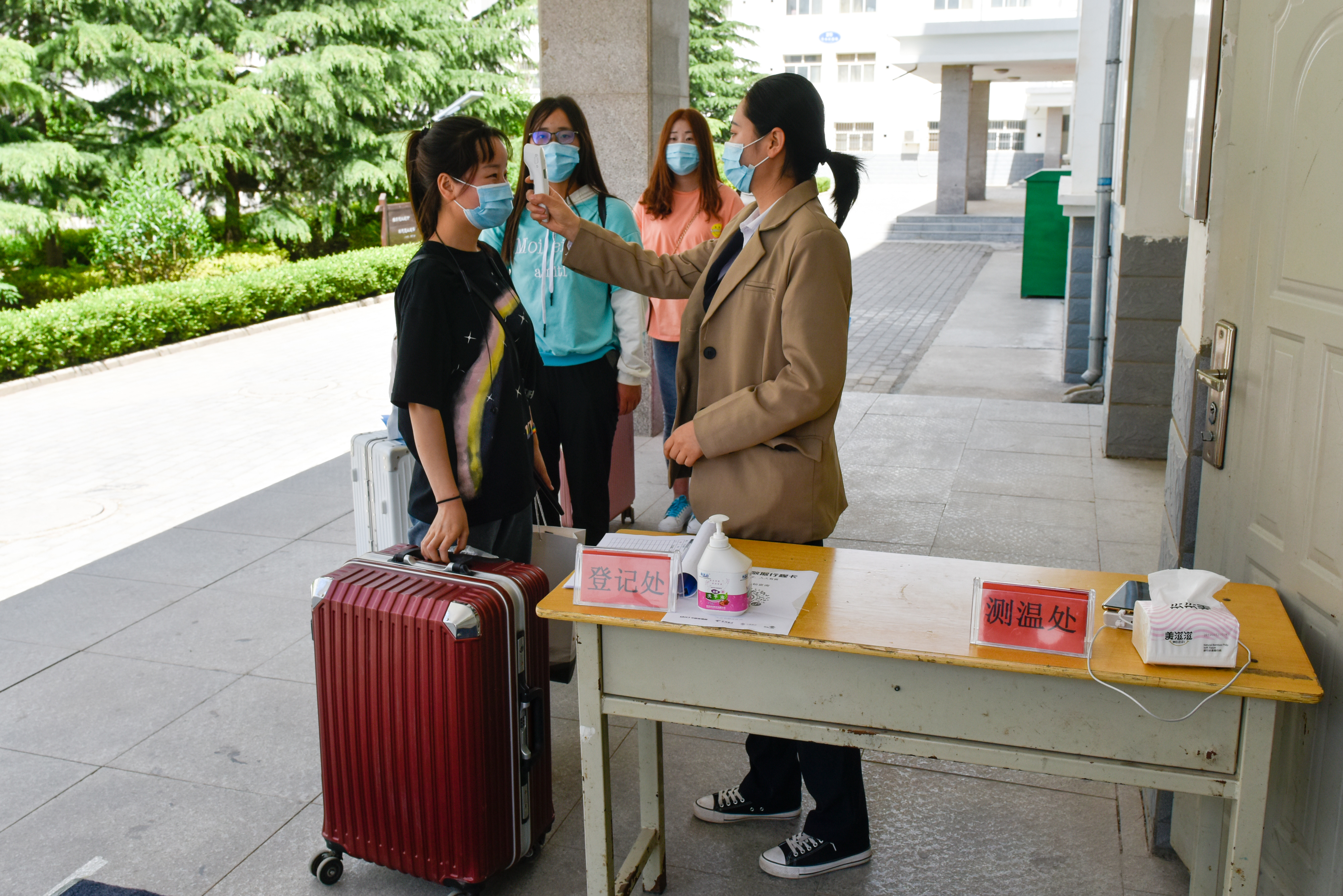 测温消毒 把好入校第一关。学院在校门设立消毒测温站,为每位返校学生赠送防护口罩,依次对学生手部和携带行李进行消毒防疫。学生在扫描健康二维码登记相关信息并接收红外测温后有序进入校园,入住宿舍。