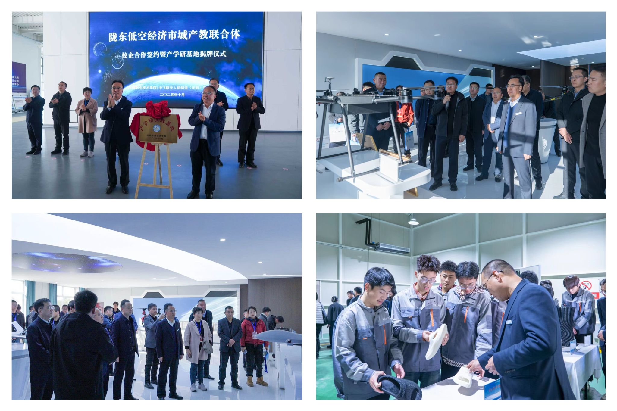 10月31日下午,与会嘉宾和师生代表走进宁县和盛工业集中区,共同见证庆阳职业技术学院与中飞航无人机(庆阳)有限公司校企合作签约暨产学研基地揭牌仪式,并实地参观调研中飞航、链景增材、泛联电子、九州维安等低空经济企业的生产研发与经营情况,深入了解低空产业发展现状与前景。工业集中区建设办公室主任高俊杰介绍了园区基本情况,学院党委书记张建军与宁县人民政府党组成员、副县长陶志金就深化校地合作、推动联合体发展进行交流。校企双方在无人机领域产教融合与合作方面达成多项共识。
