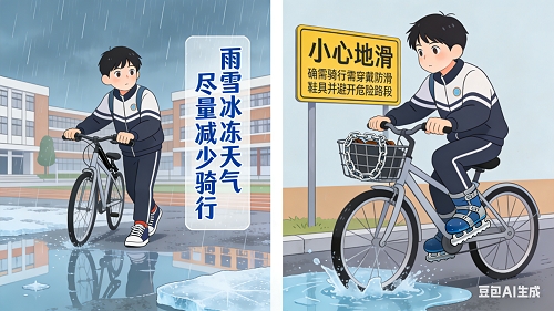 4. 雨雪、冰冻天气尽量减少骑行;确需骑行的,建议穿戴防滑鞋具,主动避开积水、结冰路段。