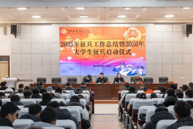 12月30日下午,庆阳职业技术学院在多媒体报告厅举行2025年征兵工作总结暨2026年大学生征兵启动仪式。西峰区人武部副部长金志平中校、学院党委副书记、院长胡志玉出席会议并讲话,党委副书记王婕主持仪式,党委委员、副院长郭伟,各二级院系党支部书记、学生工作副主任、辅导员及学生代表共300余人参加。