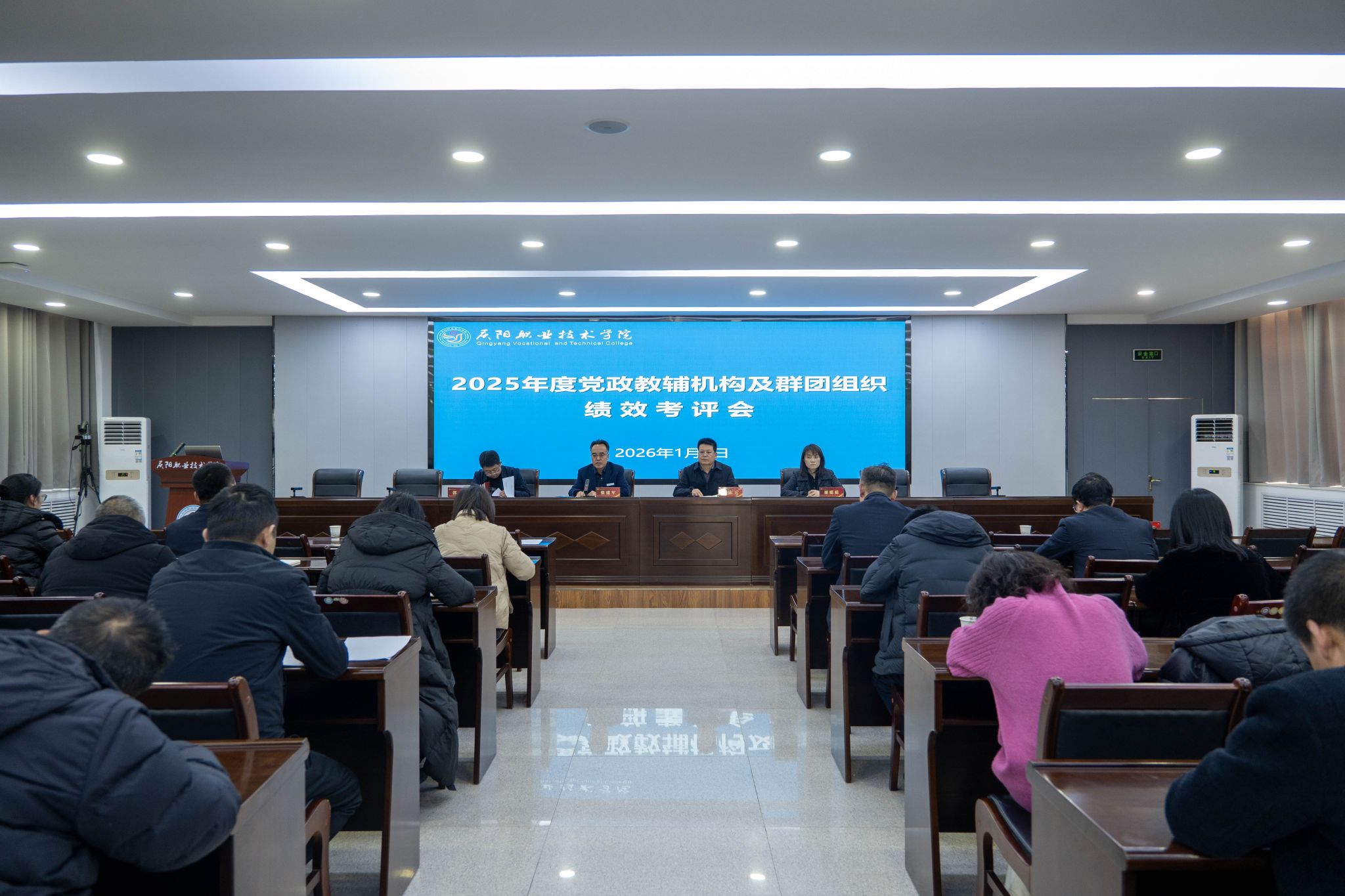 为全面总结2025年度工作成效,客观评价部门履职实绩,深入查找问题不足,明确2026年工作方向,根据工作安排,1月7日下午,学院召开2025年度党政教辅机构及群团组织绩效考评会。党委书记张建军出席并讲话。在家班子成员、全体中层干部参加,党委副书记、院长胡志玉主持会议。