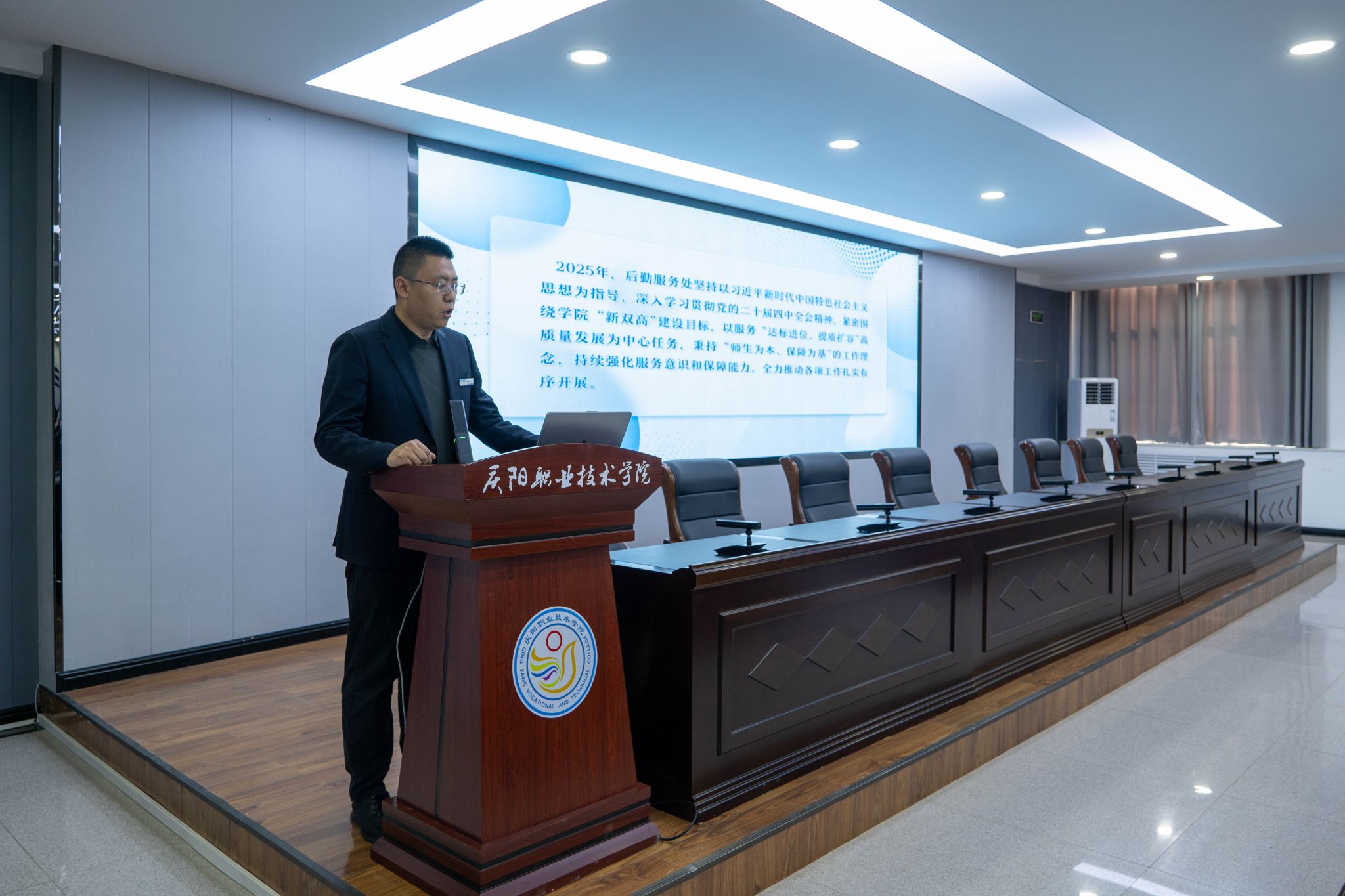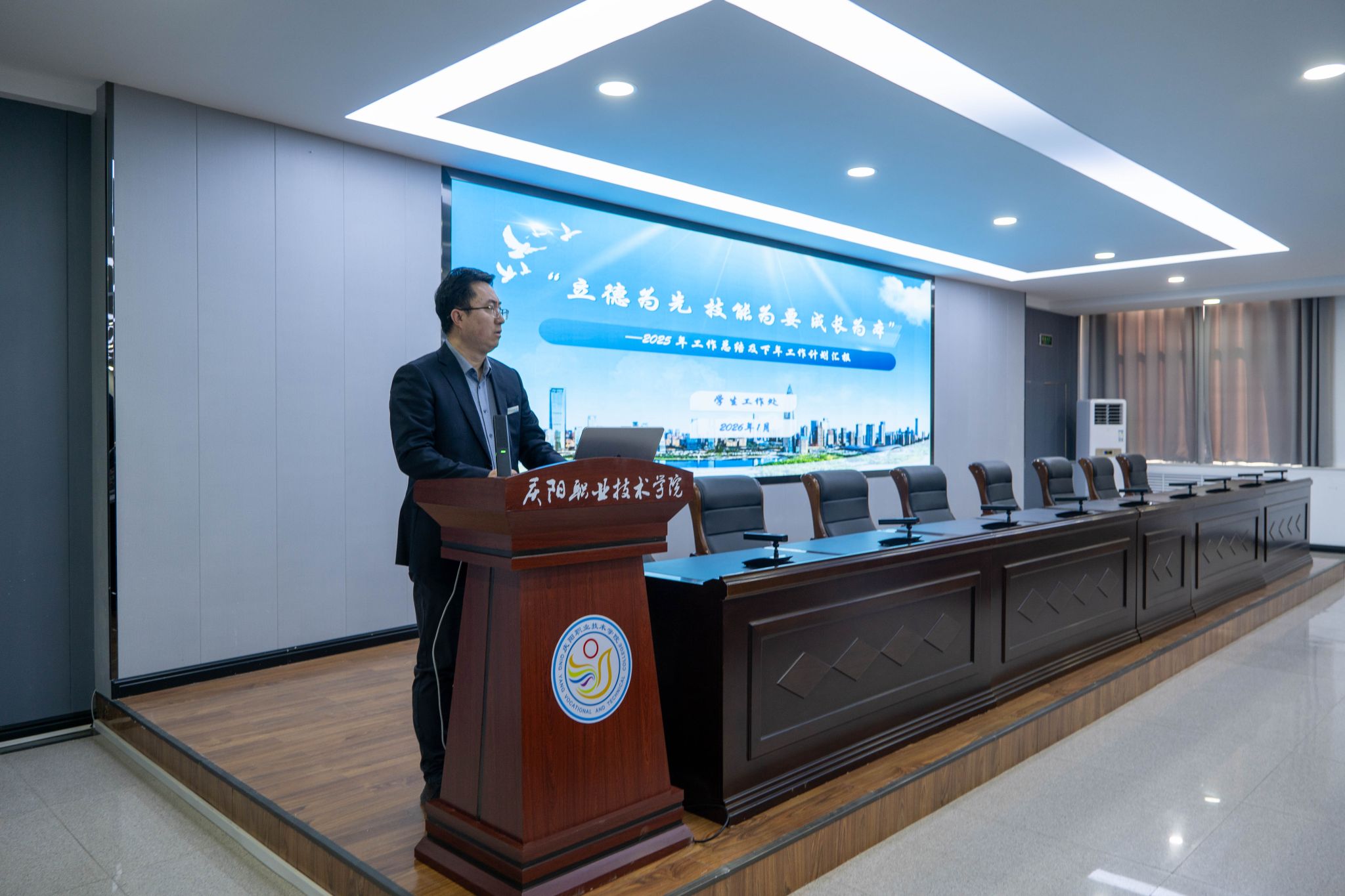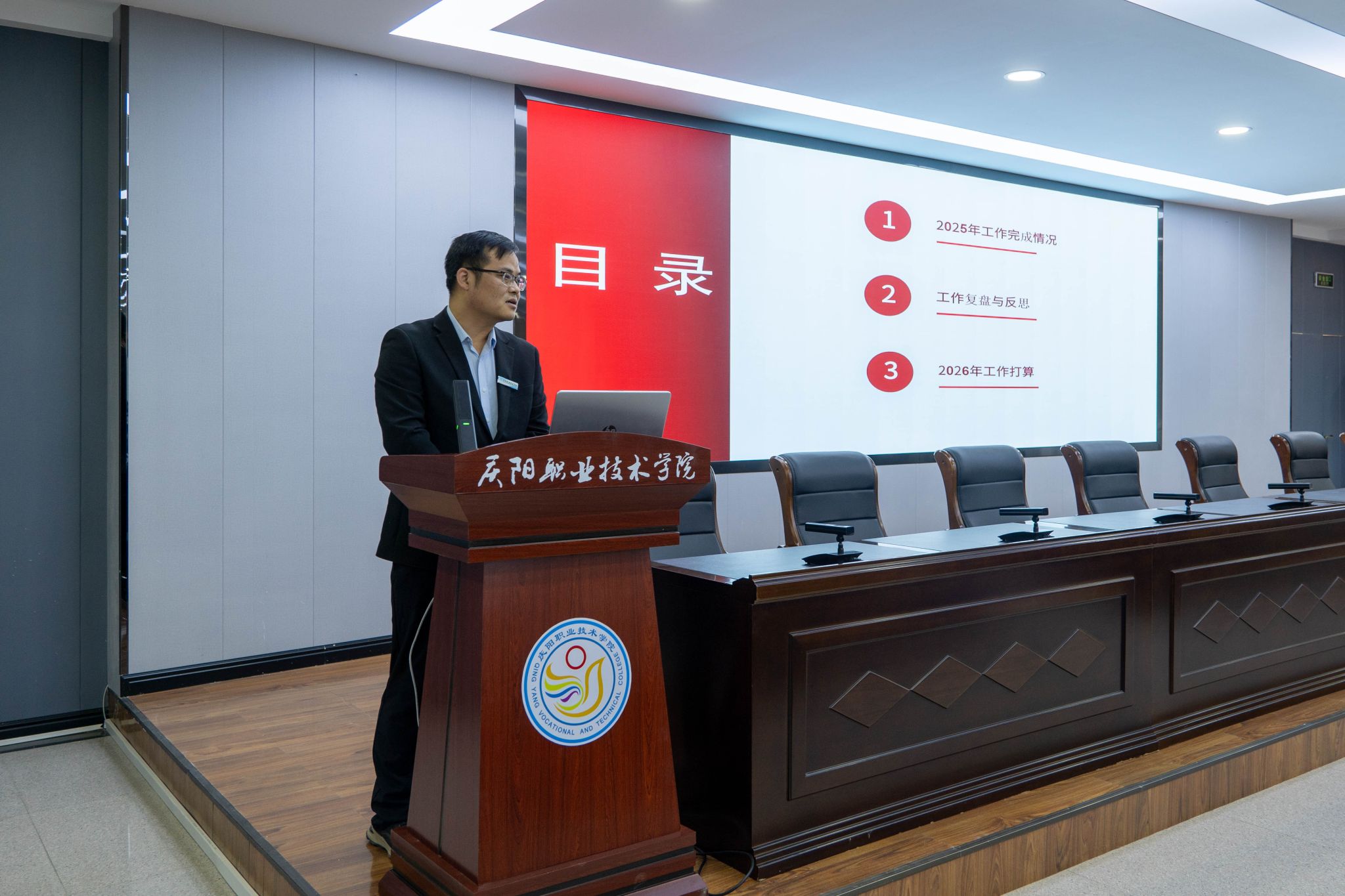 会议充分肯定了各部门在2025年度所取得的工作成绩。会议指出,2025年各部门聚焦主责主业,在服务发展大局、提升工作质效、强化内部管理等方面持续发力,推动各项任务落地见效,展现了良好的精神风貌和责任担当,为学院高质量发展奠定了坚实基础。一是党建引领持续加力,创建“匠心育才 技能报国”党建品牌,培育“数聚匠心”“文旅红心”等8个支部品牌,胜利召开第三次党员大会,选举产生新一届党委委员,办学方向更加端正,立德树人落地有声。二是思想观念持续新进,聚焦“匠心育才”初心使命、“东数西算”国家战略、“低空经济”新兴领域、“能化新都”基地定位、“农文旅融合”特色产业,推动专业设置与产业需求精准对接,大数据技术专业跻身省级高水平专业群建设计划,发展特色愈发鲜明。三是管理机制持续增效,二级院系平稳运行,职能部门与系(院)协同发力,管理效能稳步提升,协同联动更加高效,执行力和落实力显著增强。四是师生素养持续攀升,教学中心地位凸显,教师培训扎实推进,师资结构不断优化,学生精神面貌焕然一新。五是产教融合持续深化,发起成立全国数字信息安全产教融合共同体、陇东低空经济市域产教联合体,服务能力稳步增强,在乡村振兴等领域实践走在前列,政校企合作迈入新阶段。六是纪律作风持续转变,全体教职工识大体顾大局,主动担当作为,干事创业氛围日益浓厚,校园清风正气充盈,为学院发展营造了良好环境。