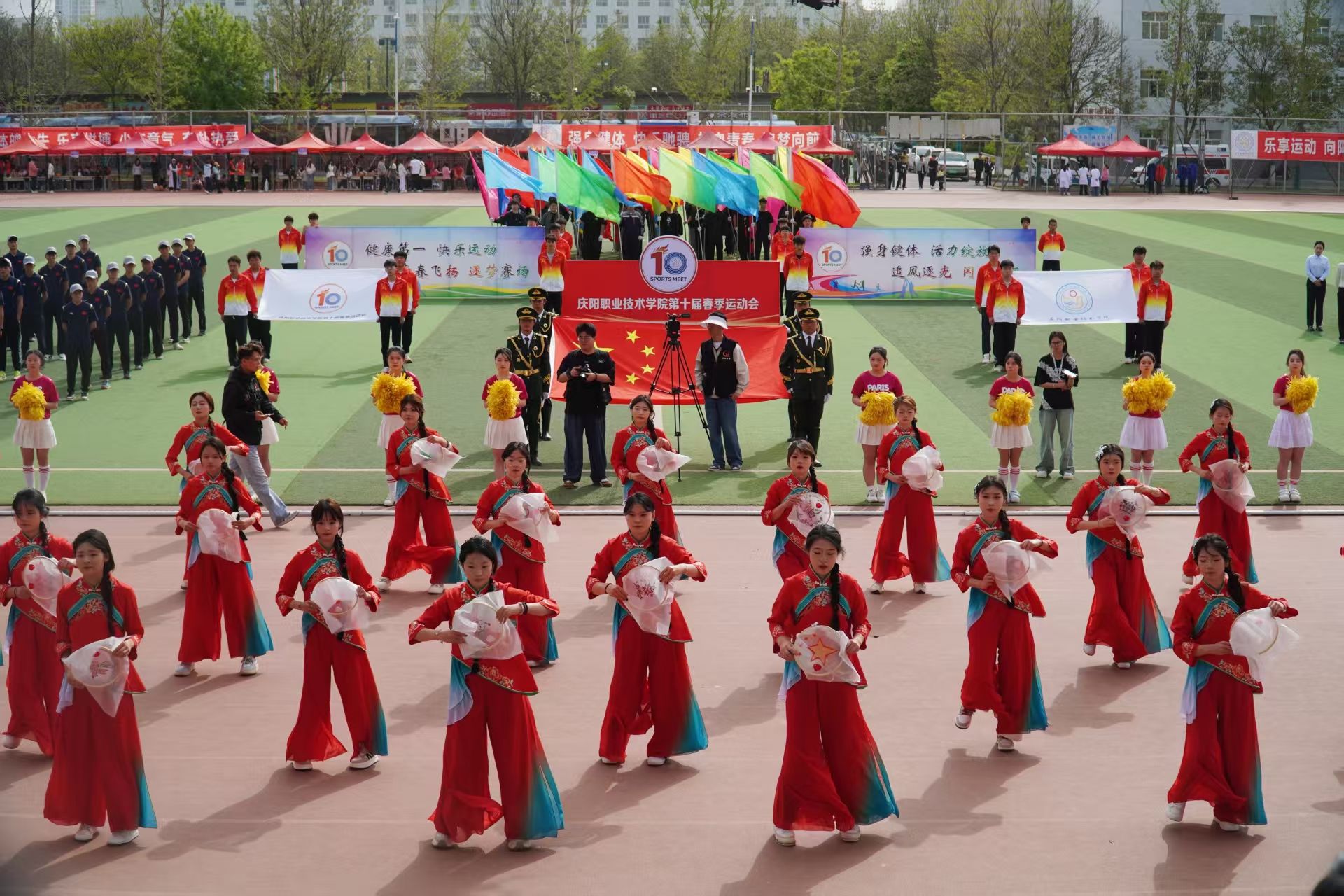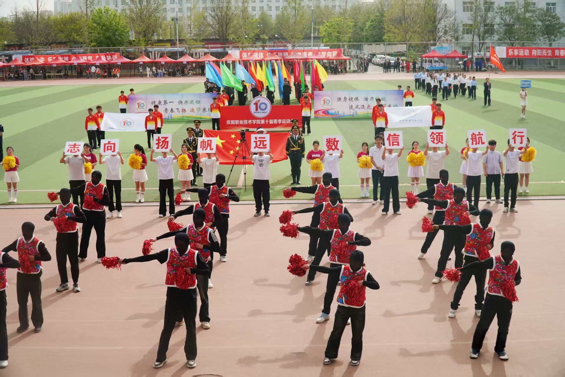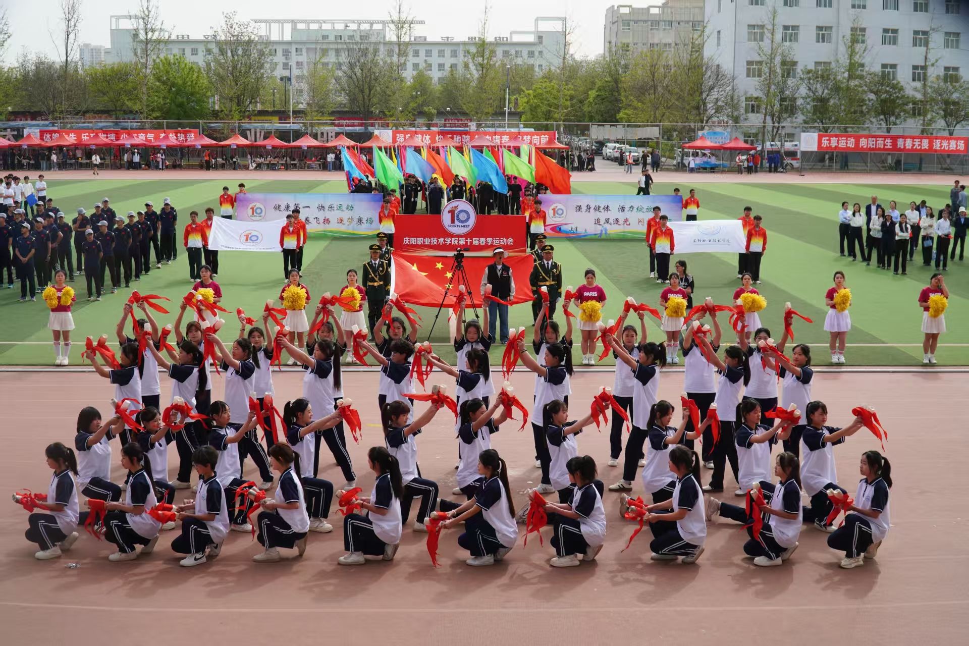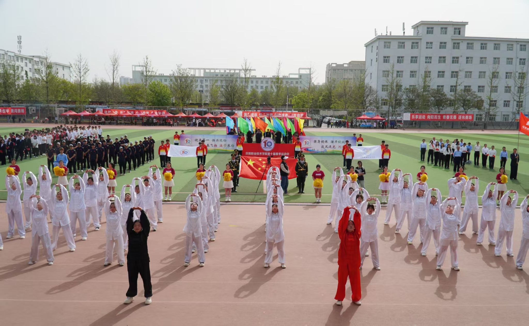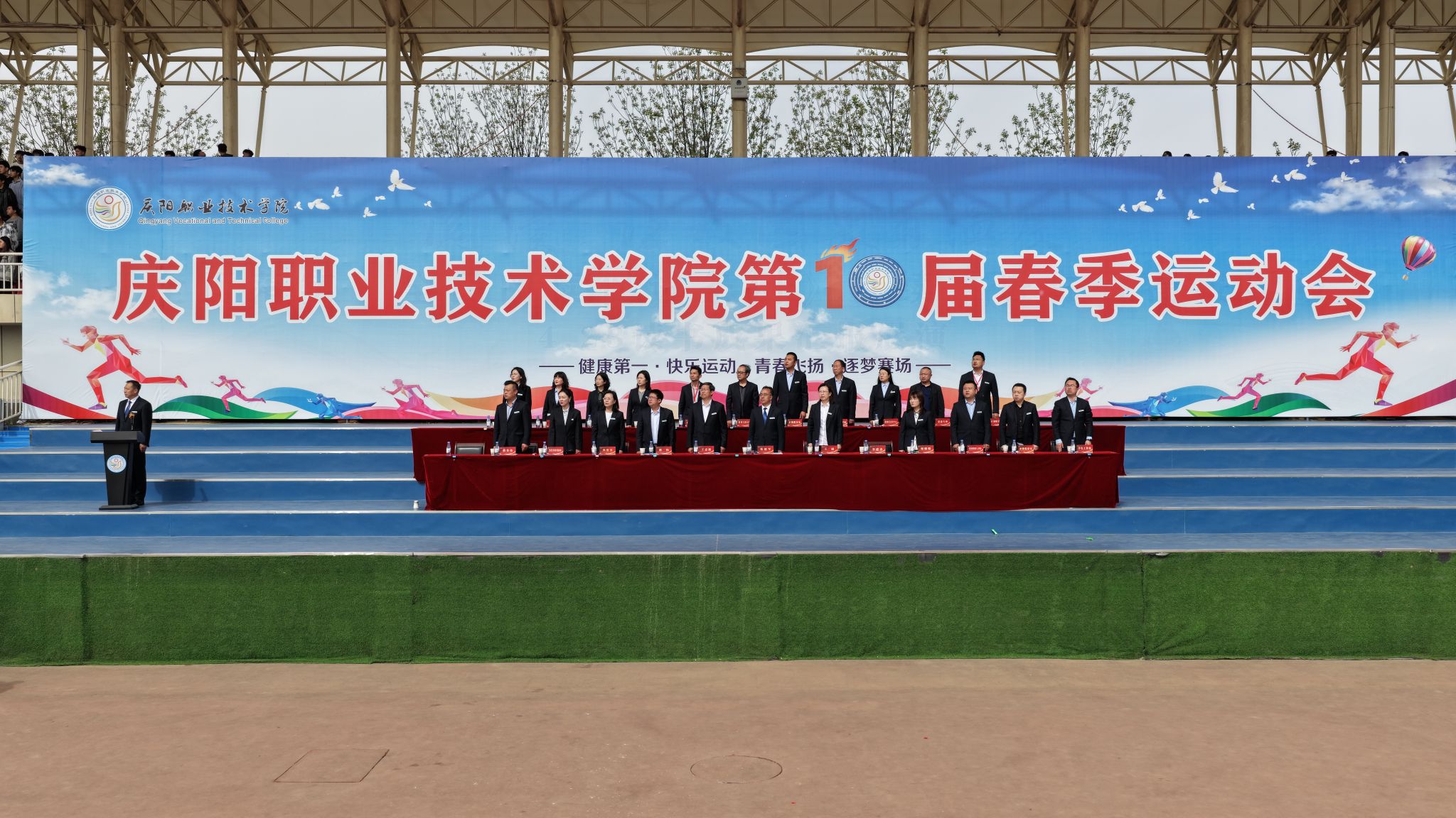 4月28日,庆阳职业技术学院第十届春季田径运动会开幕。党委书记张建军宣布运动会开幕,党委副书记王婕致词,党委委员、副院长李建杰主持。在家班子成员,各部门负责人,全体在校师生共计7000余人参加开幕式。