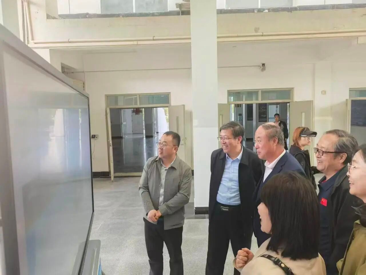 会后,与会人员在会议室走廊观摩了现场展示,通过大屏演示、成果展架、新产品推介等形式,集中展示了智慧校园建设目标、建设内容、应用系统架构,以及校园一卡通、智能宿管门锁等应用场景。