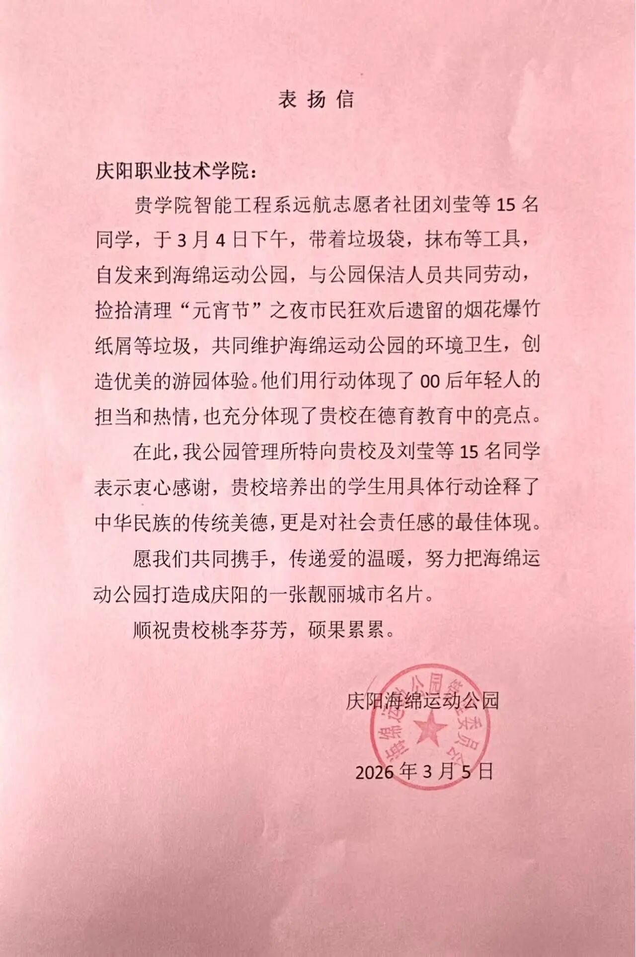 近日我院收到庆阳海绵运动公园管理所发来的表扬信,对智能工程系远航志愿者社团刘莹老师及 14 名学生志愿者,在3月4日下午自发前往公园,清理“元宵节”夜市狂欢后遗留垃圾的志愿服务行为,给予了高度评价。