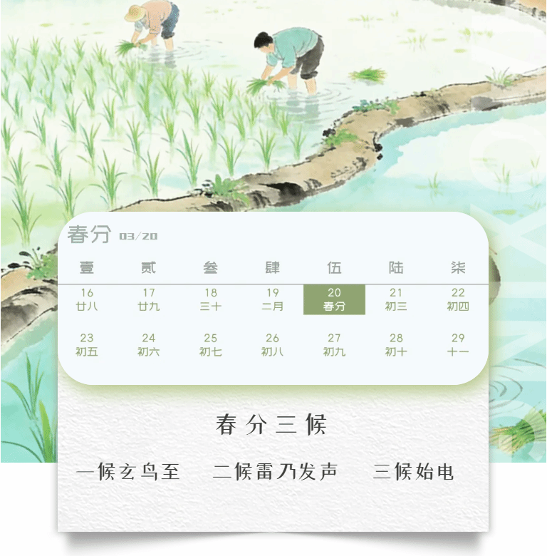 春分是二十四节气中的第四个节气。《月令七十二候集解》写道,“二月中,分者半也,此当九十日(春季)之半,故谓之分。”此时昼夜均等,寒暑平和,燕子北归,春雷始鸣,闪电初现。