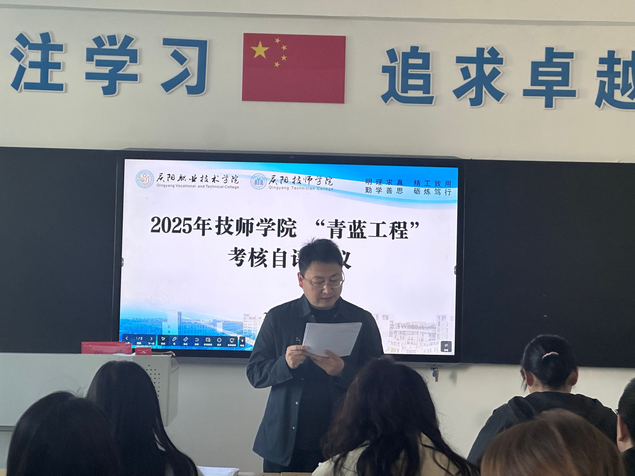 9月24日下午,技师学院在臻善楼207召开2025年“青蓝工程”考核自评会议,全面总结本学年该工程实施成效。会议由技师学院系主任闫锋主持。