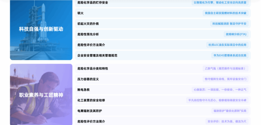 《化工安全技术》将 “生命至上”“工匠精神”“红线意识” 等思政目标融入全教学模块,培养学生的安全职业信仰与社会责任感;