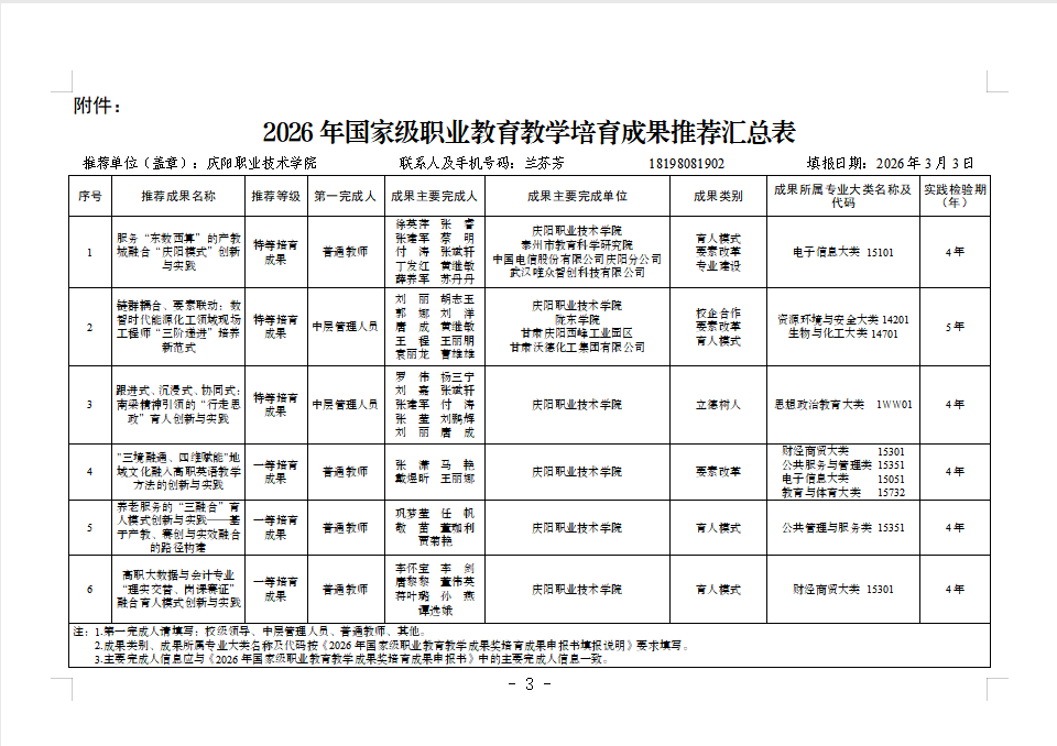 根据《关于开展2026年国家级职业教育教学成果奖培育遴选工作的通知》文件精神,经团队申报、专家评审论证、学校专业建设与教学指导委员会审定,《服务“东数西算”的产教城融合“庆阳模式”创新与实践》等6个项目符合推荐标准,现将名单予以公示,公示期为2026年3月3日-3月7日。公示期内,如对公示内容有异议,请以书面、电话形式向学院纪检监察室、教务处反映。公示期内未收到异议,公示结束后将上报培育遴选作品名单。