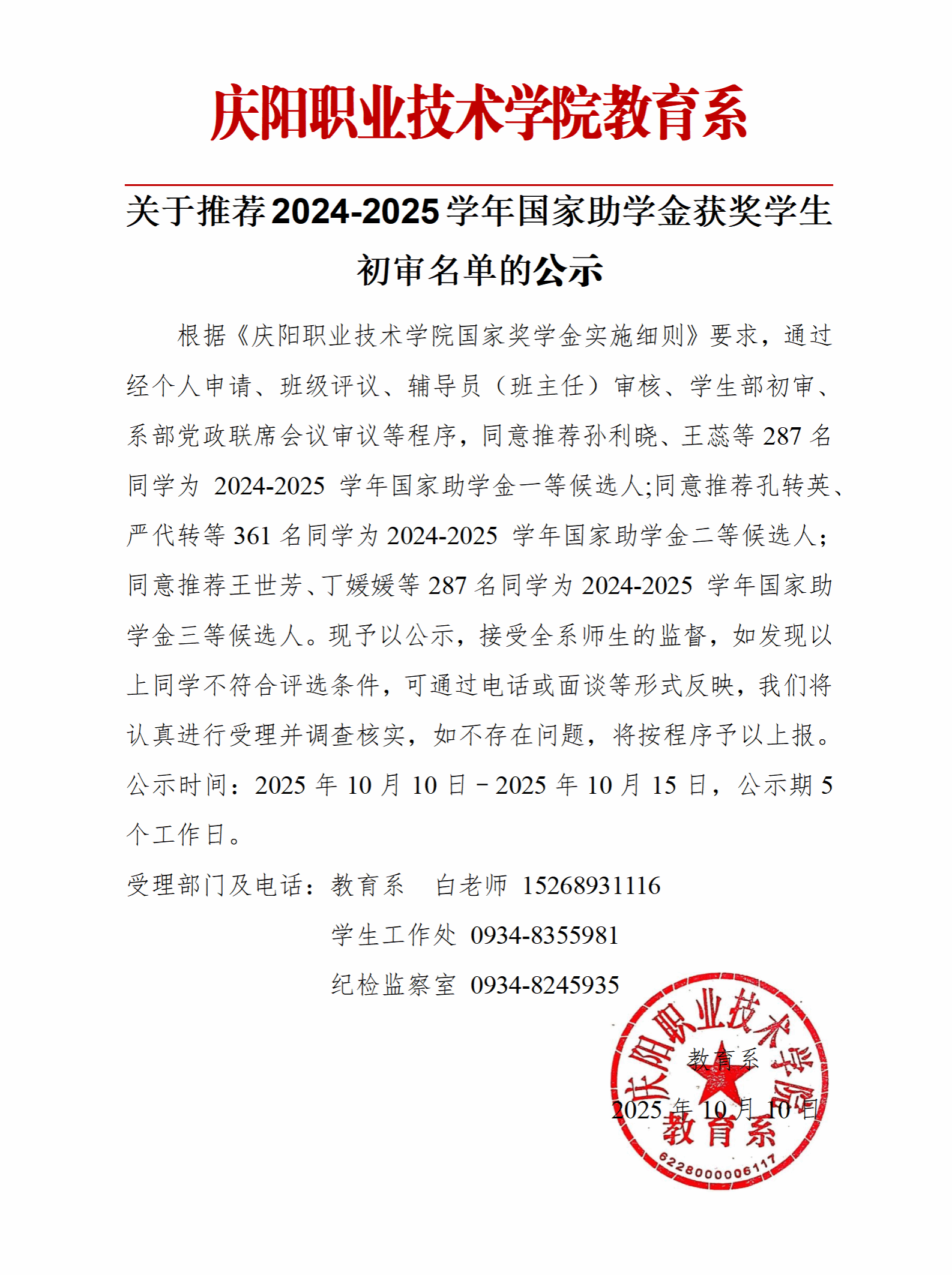关于推荐2024-2025学年国家助学金获奖学生初审名单的公示