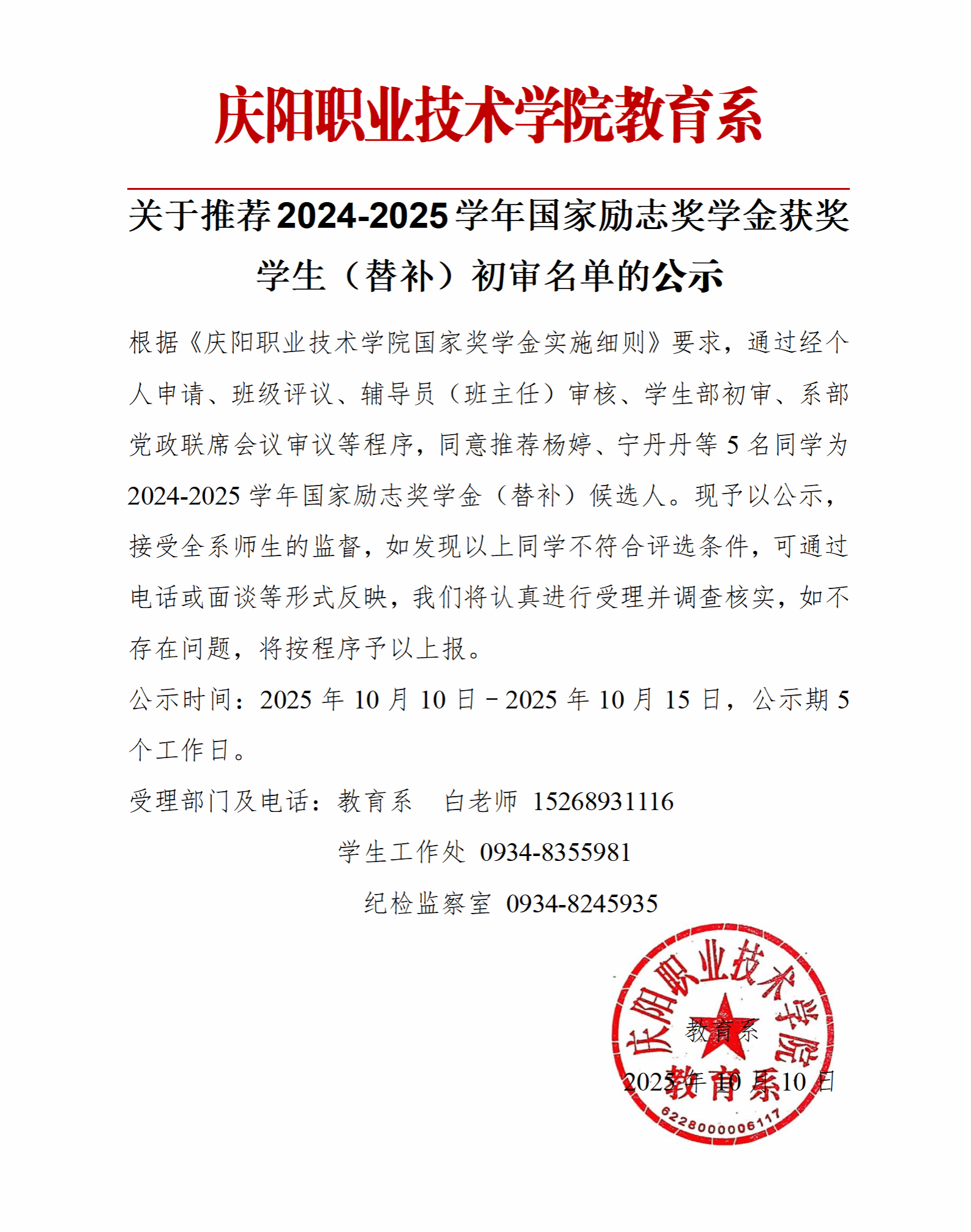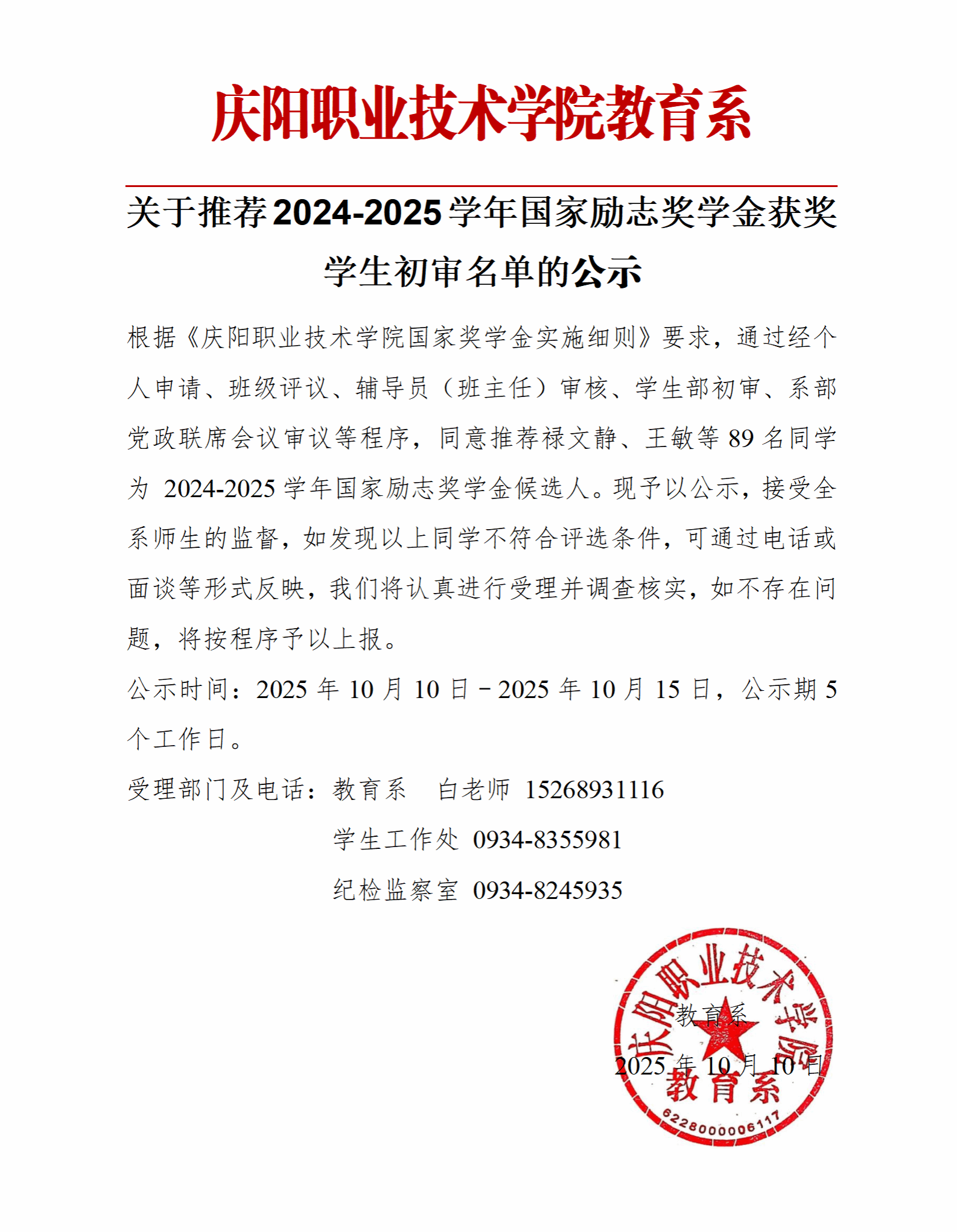 关于推荐2024-2025 学年国家励志奖学金获奖学生初审名单的公示