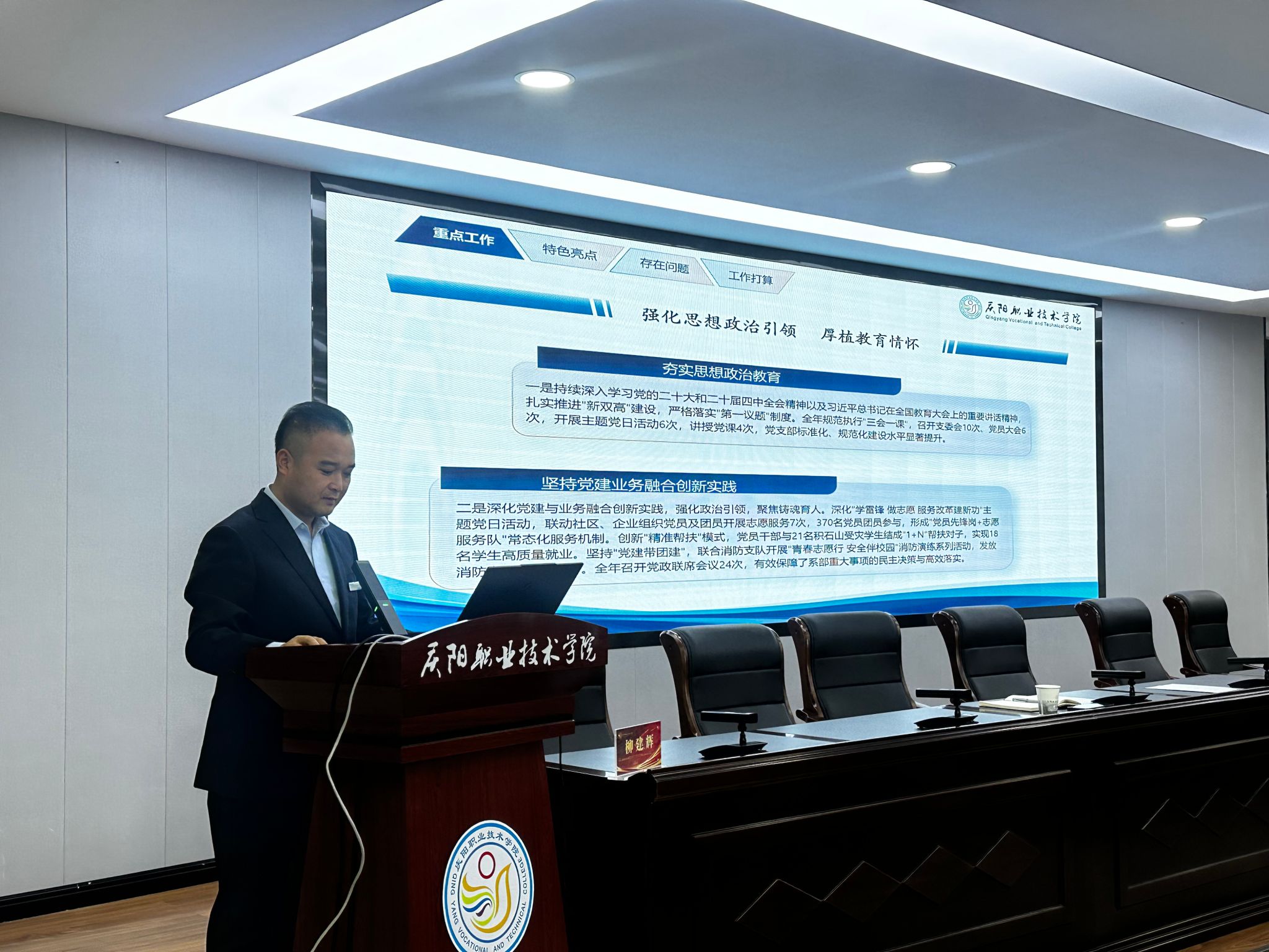 教育系主任柳建辉代表系部作2025年度工作总结报告。报告全面回顾了过去一年的工作。2025年,教育系以学院高质量发展行动规划为引领,各项工作扎实推进:党建与业务深度融合,“精准帮扶”机制成效显著;教学运行平稳有序,圆满完成大规模毕业、实习及各类考证组织工作;师生在省级及以上技能竞赛与文体赛事中屡获佳绩,斩获多项一等奖;实践育人体系、“书香院系”建设及“三赛三节”品牌活动蓬勃开展;2025届毕业生就业率保持高位,达90.98%。报告统阐述了2026年度工作计划,明确将在党建联建、管理机制优化、校企合作深化、专业动态调整及教学资源建设等方面重点发力,推动系部发展迈上新台阶。