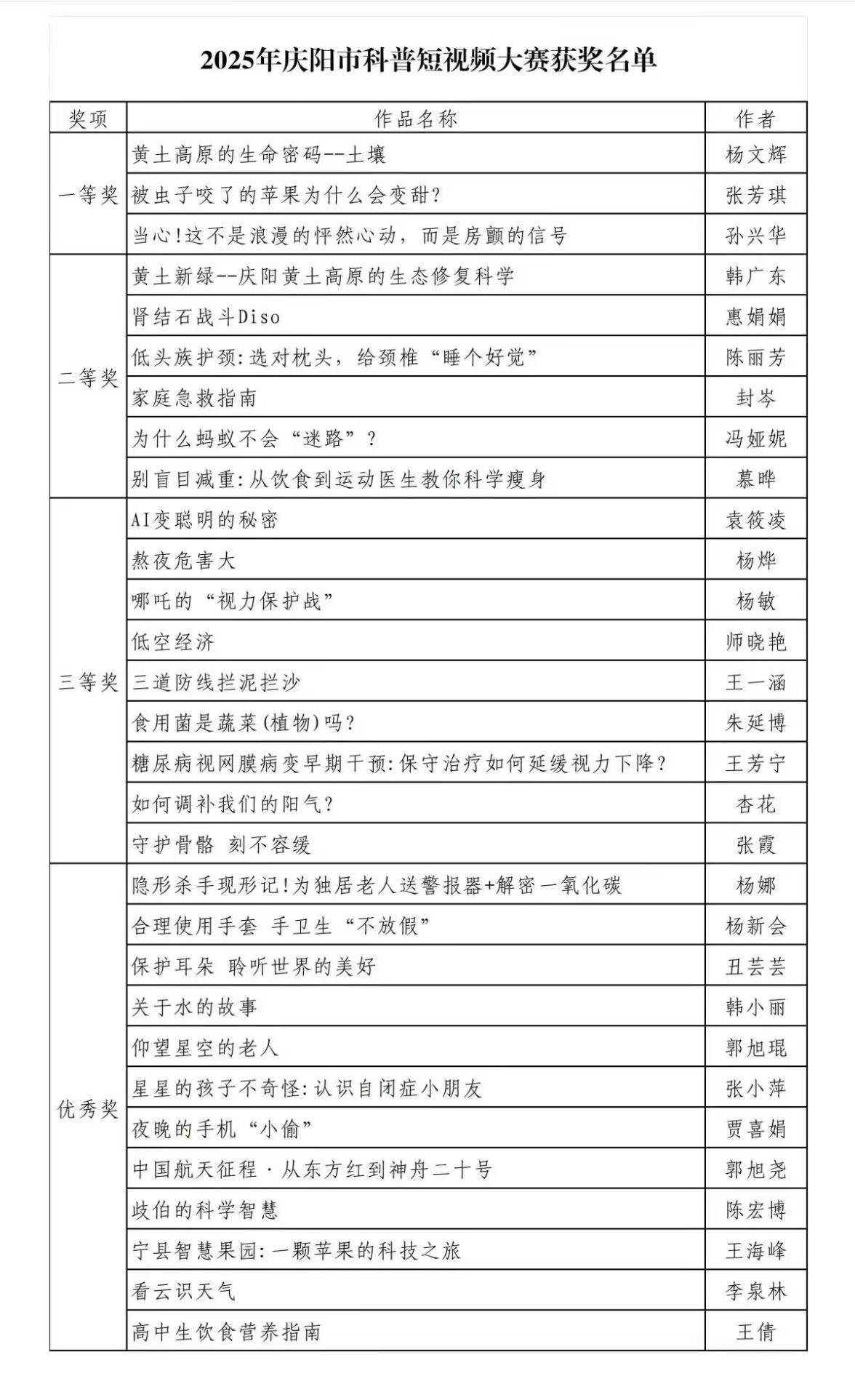 据悉,本次大赛由庆阳市科学技术局主办,以传播科学知识、弘扬科学精神为宗旨,共征集到有效科普作品104件。经过专家严谨评审,最终评选出一等奖3名、二等奖6名、三等奖9名及优秀奖12名。大赛为全市科普工作者搭建了交流展示平台,有效推动了科普传播形式创新。