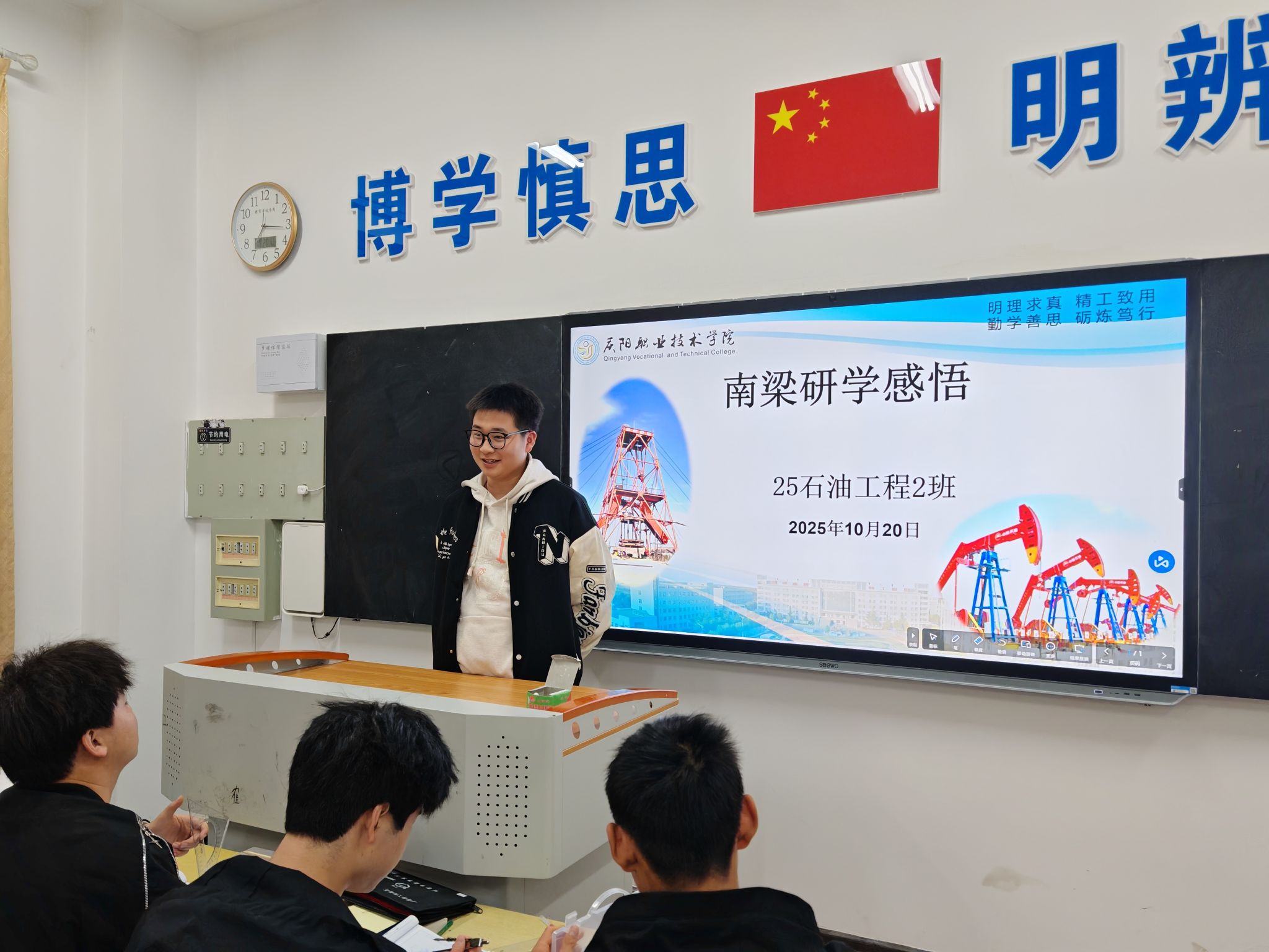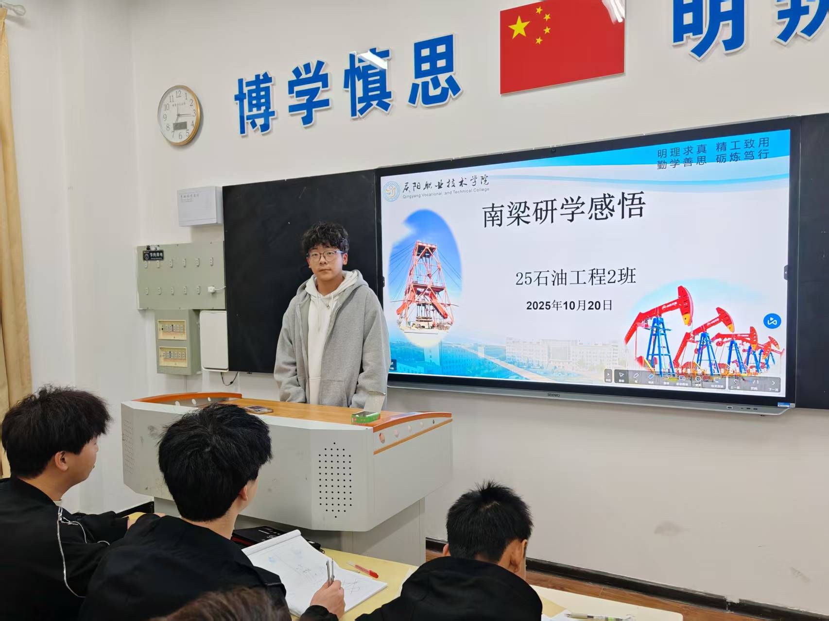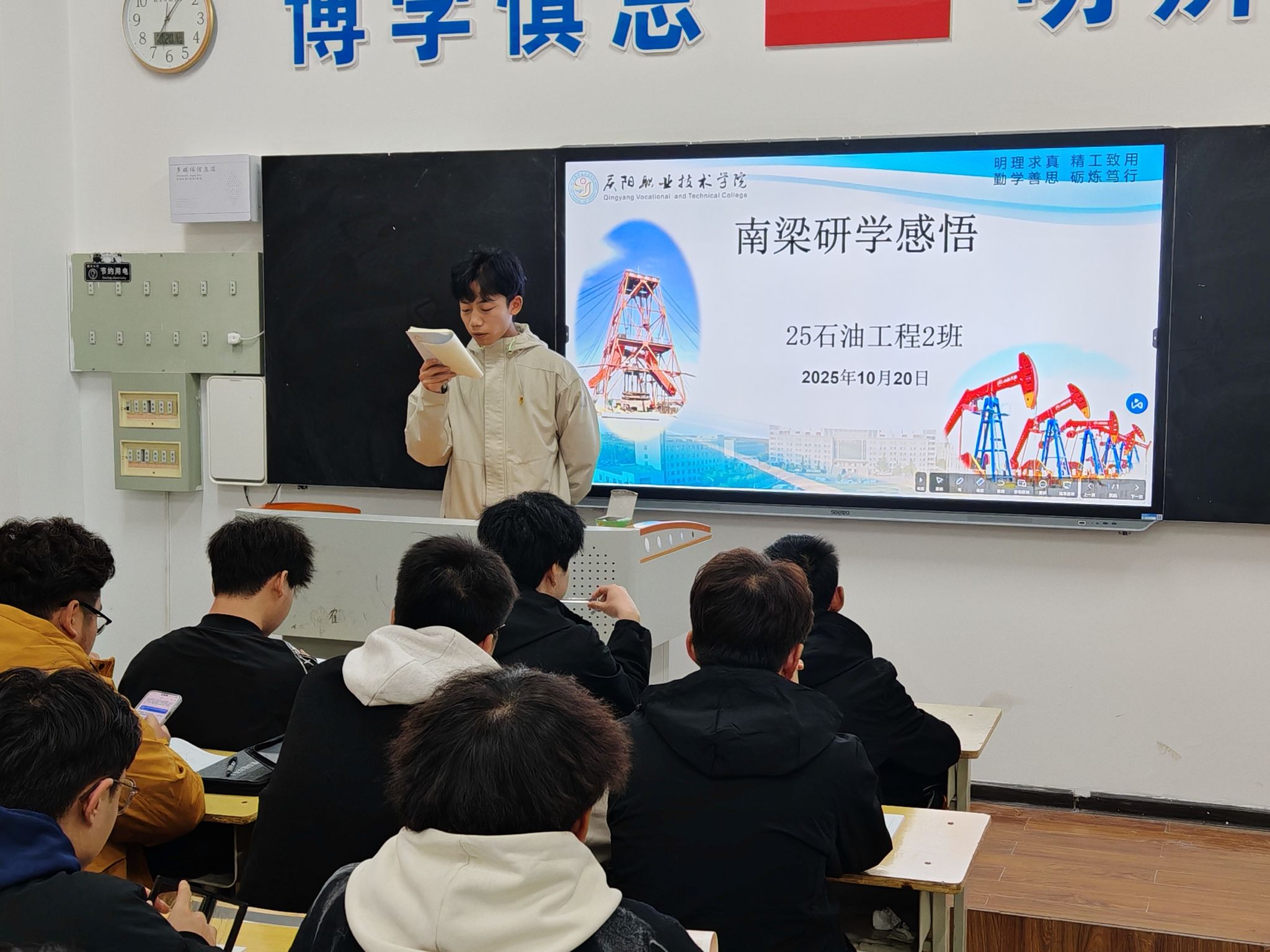 研学归来,感悟在心,分享在行。我系各班级迅速行动,以主题班会、分享报告会、征文展示等多种形式,组织同学们畅谈研学体会。石油化工1班、石油化工3班、光伏2班等班级的同学们精心准备了发言稿和PPT,将他们在南梁的深刻感悟带回班级,与未能亲临现场的同学共同分享。