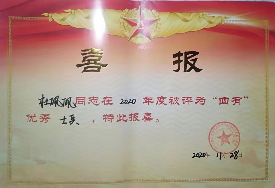 “丈夫皆有志,会见立功勋”, 杜佩佩同学为2018级运动训练班学生,于2019年9月在学院应征入伍,在部队服役期间,严格要求,刻苦训练,在政治思想、训练作风和军事素质等各个方面都表现十分突出,在2020年度考核中被评为“...