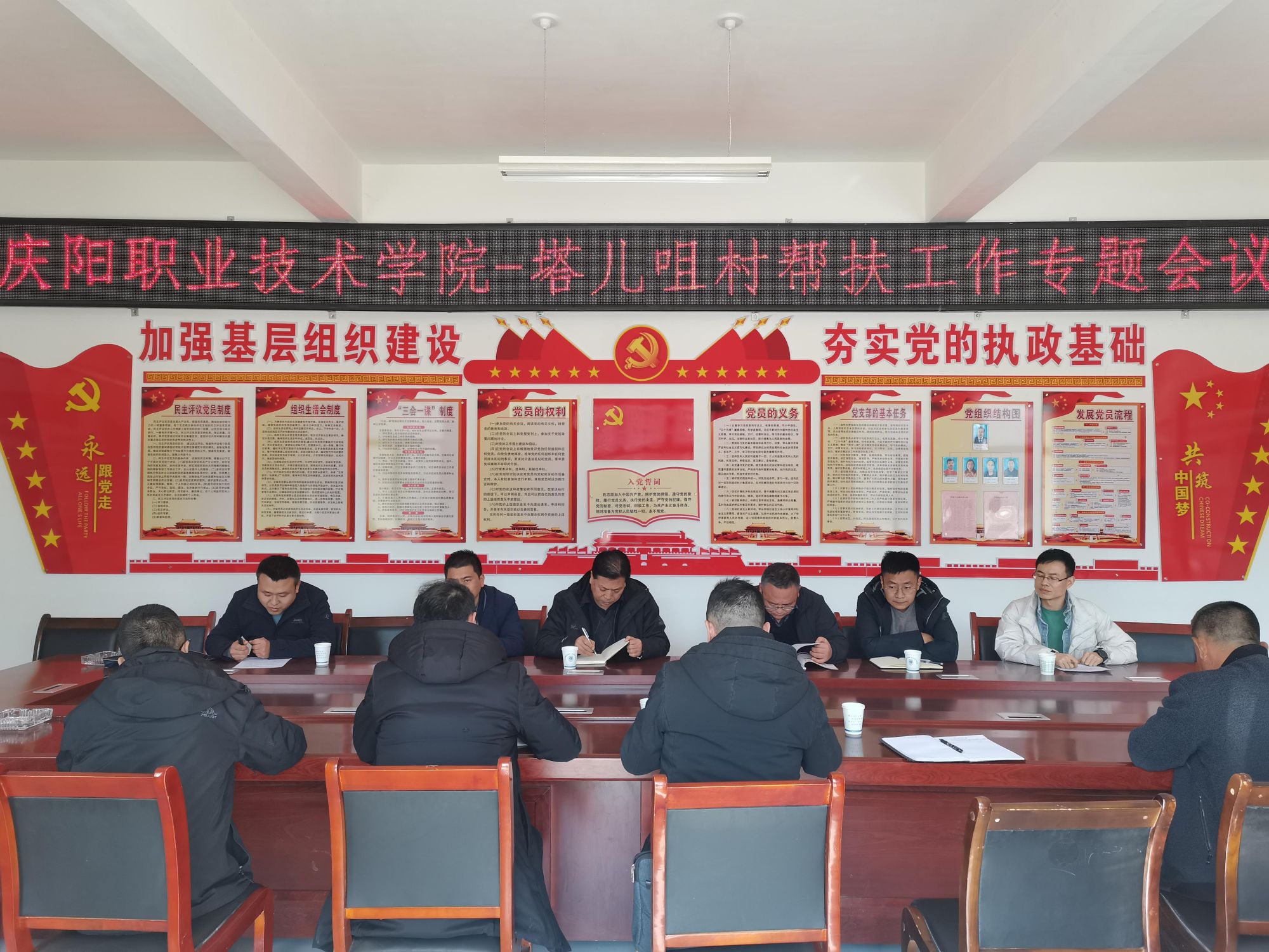 11月19日,庆阳职业技术学院塔儿咀村帮扶工作专题会议在环县八珠乡塔儿咀村部召开,安排部署驻村帮扶工作,并对驻村工作期满人员进行了轮换。庆阳职业技术学院党委委员、副院长曹强,包村领导耿红魁、八珠乡司法所所长程轶平、...