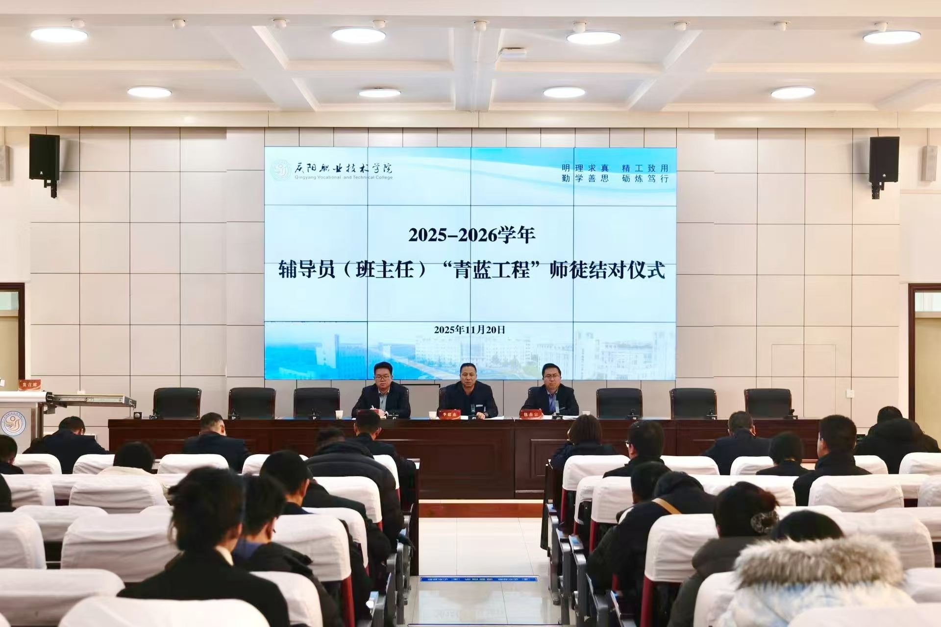 11月20日下午,庆阳职业技术学院在多媒体报告厅举行2025-2026学年辅导员(班主任)“青蓝工程”结对仪式。学院党委委员、副院长李建杰出席仪式,各系(院)负责人及全体辅导员参加。仪式上,学生工作处相关负责同志宣读了《庆阳职业技术学院2025-2026学年辅导员(班主任)“青蓝工程”师徒结对活动实施方案》,明确了目标任务与具体安排。学院领导为受聘指导教师颁发聘书,标志着新一期师徒结对关系正式建立。在发言环节,指导教师代表卿嫦表示将切实履行“...