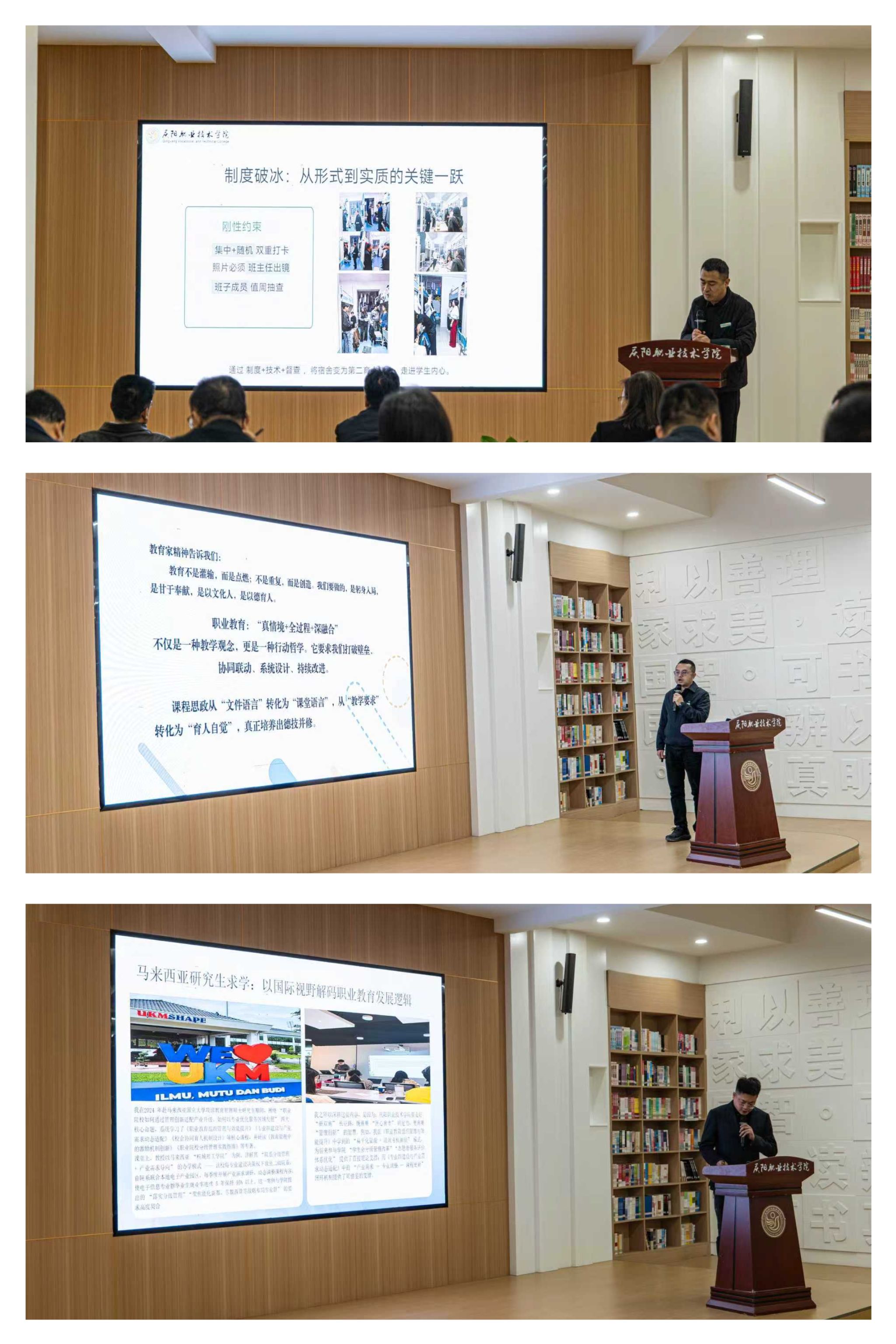 作为学院“三讲六新三促”活动的重要载体,今后交流分享会将形成常态化机制。11月起,还将在师生层面陆续开展“年轻教师讲新研究新实践”“青年学生讲新见识新创意”活动,进一步拓展交流广度与深度,推动实现“促管理增效、促教研提质、促成长成才”目标,为培养更多高素质技术技能人才筑牢思想根基、夯实实践路径。